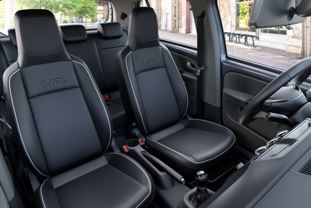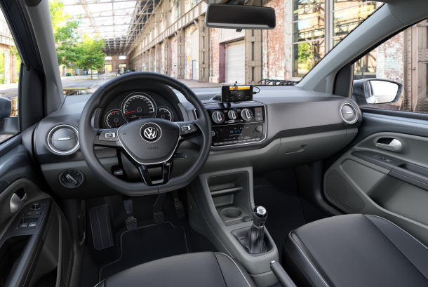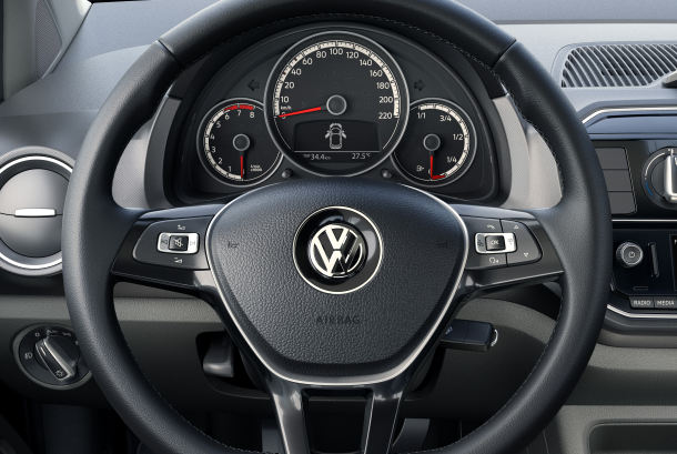 Internamente, o novo up! também foi reformulado. No painel de instrumentos, o motorista acompanha as informações do veículo por meio de três mostradores circulares. A tela com iluminação branca e o velocímetro ficam na parte central, o conta-giros fica à esquerda e o marcador do nível de combustível à direita.
