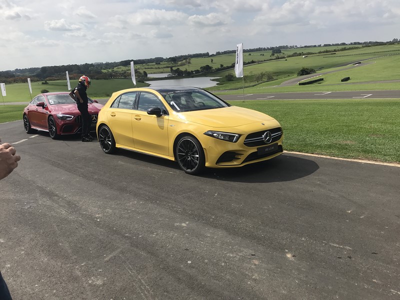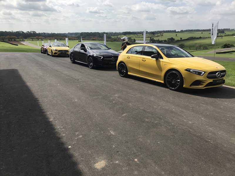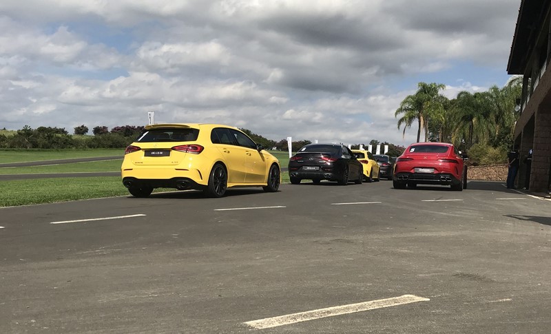 Balaclava e capacete vestidos, era a hora de acelerar os carros. Cada jornalista podia dar uma volta em cada modelo, recolhendo aos boxes antes da linha de chegada da pista. E tudo era muito rápido. Saiu de um carro, entra em outro. Dessa forma, foi possível sentir as diferenças de cada um dos esportivos. Menos potente da turma, com 306 cv, o AMG A 35 foi o primeiro. Versão apimentada do Classe A, ele se mostrou um dos mais legais ao volante. Sua dinâmica em curvas chega até a lembrar a de um kart. Sua resposta é afiada e imediata, arrancando sorrisos dos pilotos.