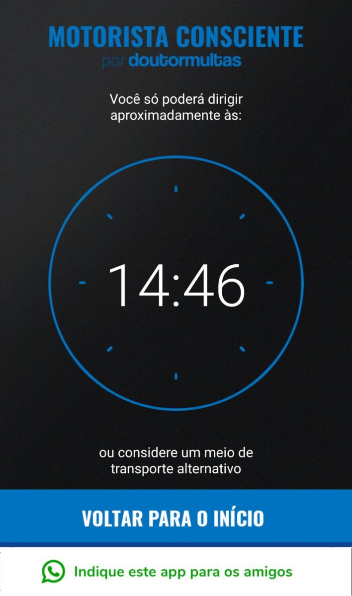 Feito pela mesma empresa que mantém o site Doutor Multas, o app é prático e intuitivo, tendo até mesmo dicas de como se comportar em uma blitz. Porém, embora sua proposta seja de alertar e conscientizar os motoristas, o melhor é não pegar o carro sob hipótese alguma se você pretende consumir bebidas alcoólicas.