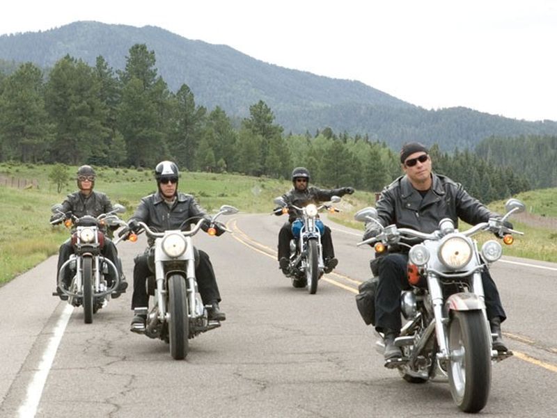 - No filme “Motoqueiros Selvagens” (2007), os amigos Woody Stevens (John Travolta), Doug Madsen (Tim Allen), Bobby Davis (Martin Lawrence) e Dudley Frank (William H. Macy) caem na estrada a bordo de motos Harley-Davidson | Foto: Reprodução