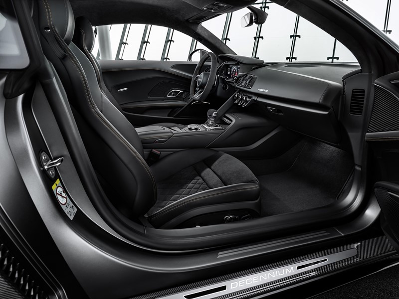 Para comemorar os 10 anos do Audi R8 V10, a marca alemã preparou uma série limitada do superesportivo, chamada de Decennium, e que terá apenas 222 unidades. Alguns detalhes internos e externos são na cor bronze, como as rodas e a tampa do motor.