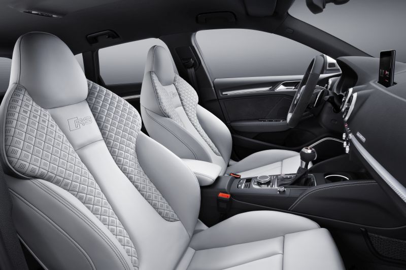 Na parte interna, o veículo exibe um virtual cockpit e bancos esportivos revestidos em couro e com emblemas da família RS. O volante, também feito em couro, apresenta botões para controlar o sistema de infotaiment e paddle shifts.