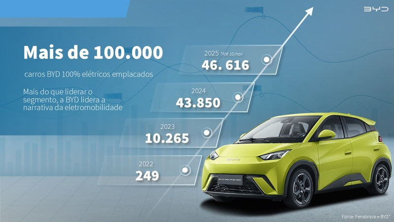 BYD supera a marca histórica de 100 mil carros emplacados no Brasil