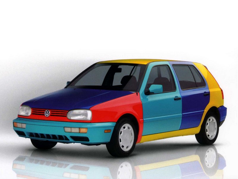 - Golf e Polo receberam na Europa a estranha versão Harlekin. Ela demonstrava a variedade de cores disponível na gama VW durante os anos 1990, pintando cada parte da carroceria com uma tonalidade |Foto: Divulgação