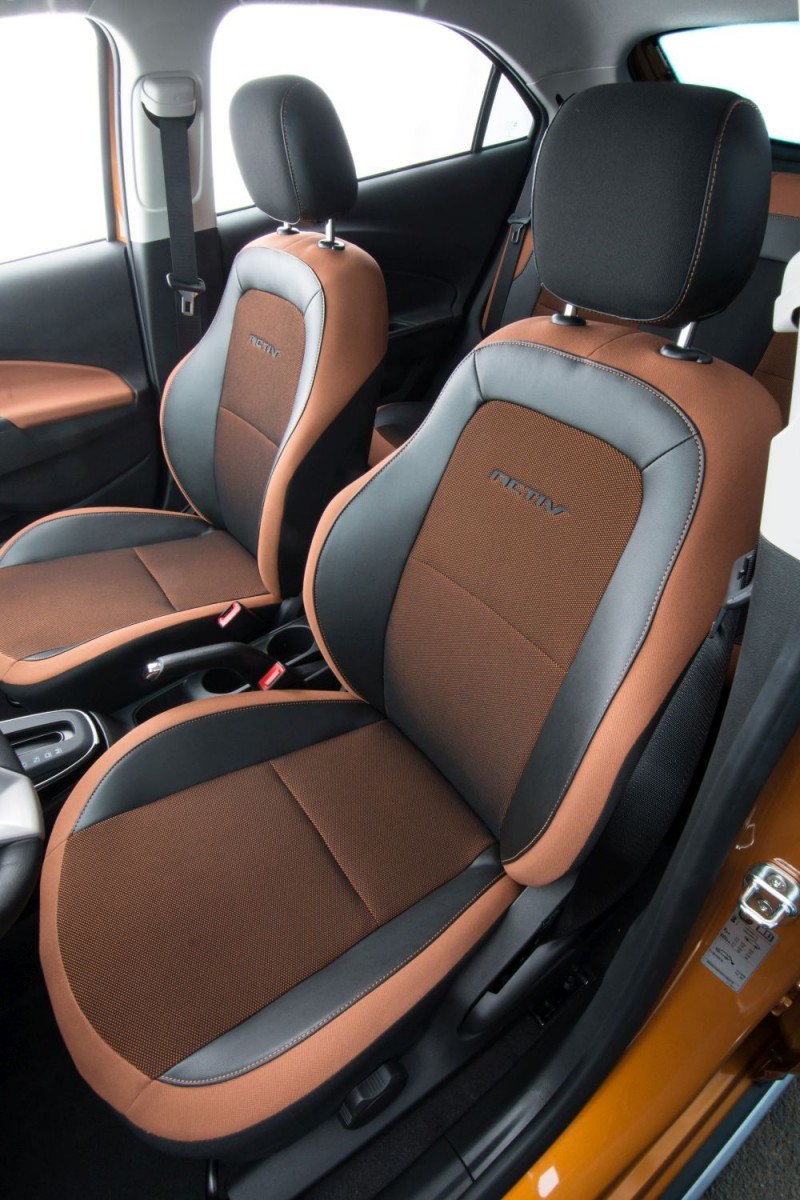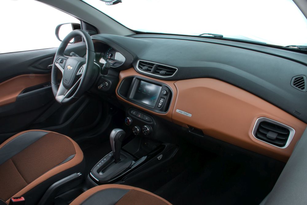 No interior, o destaque é o exclusivo acabamento em preto e laranja, além dos itens de conectividade, como a central multimídia MyLink e o OnStar, que no Onix Activ vem com seu pacote mais completo – inclui monitorar diagnósticos do veículo por meio de um aplicativo no celular, auxilio em caso de roubo ou furto, serviços de emergência e assistência mecânica, elétrica ou médica.