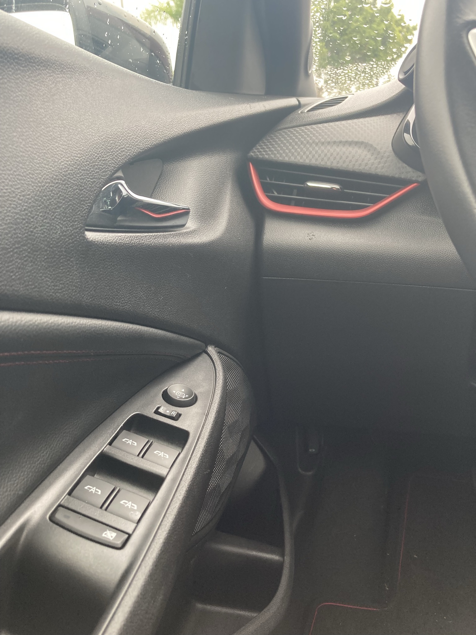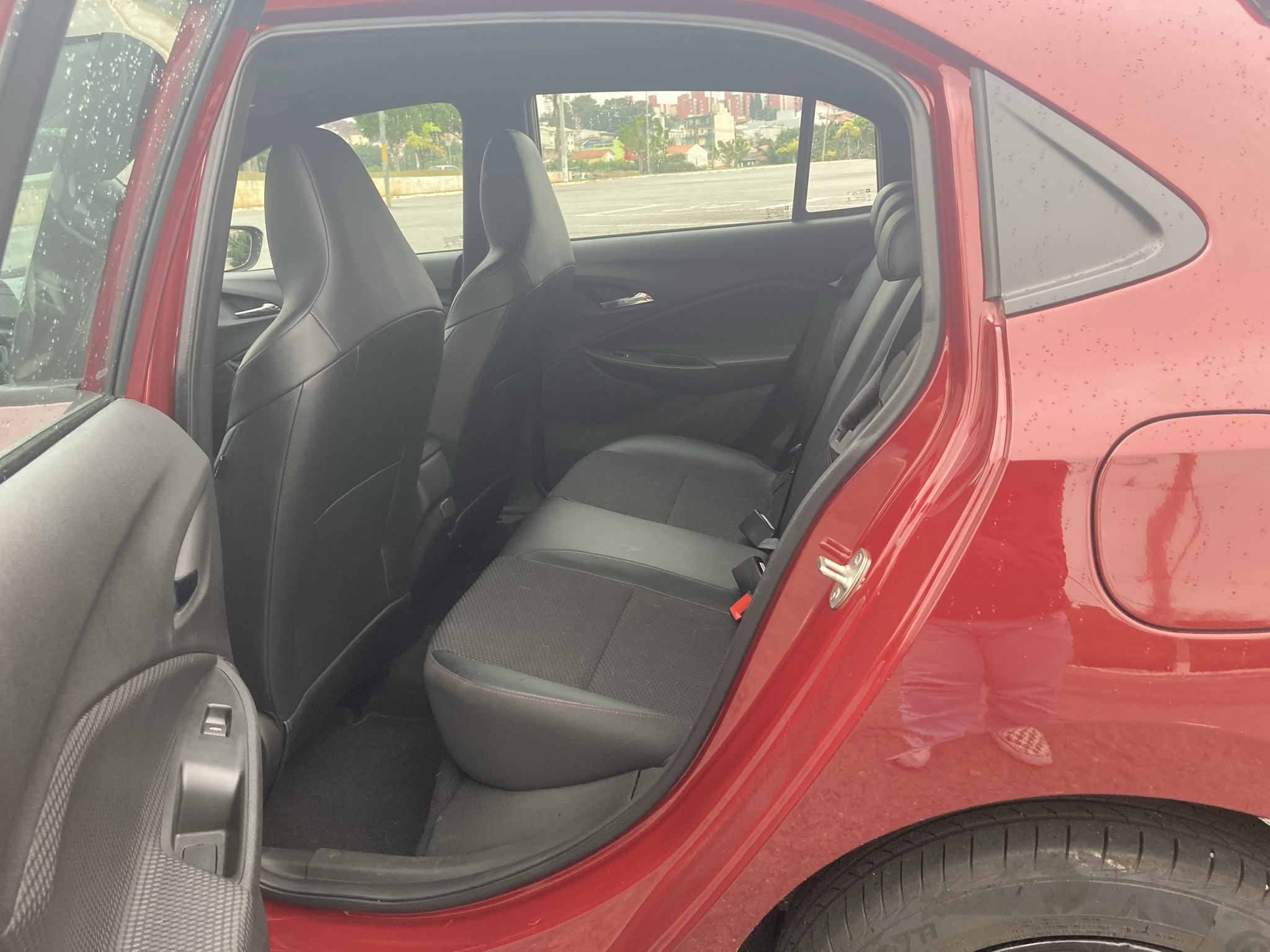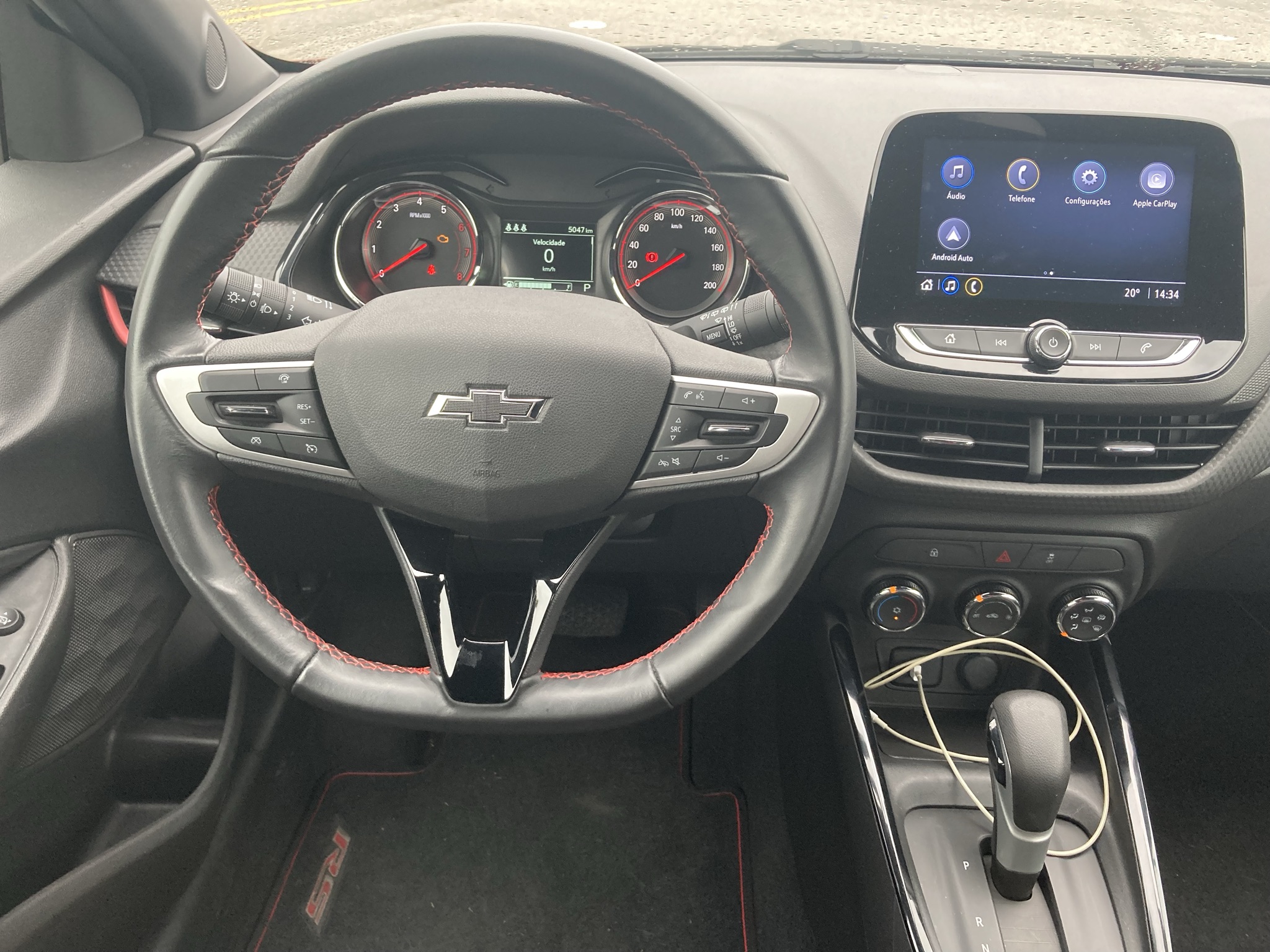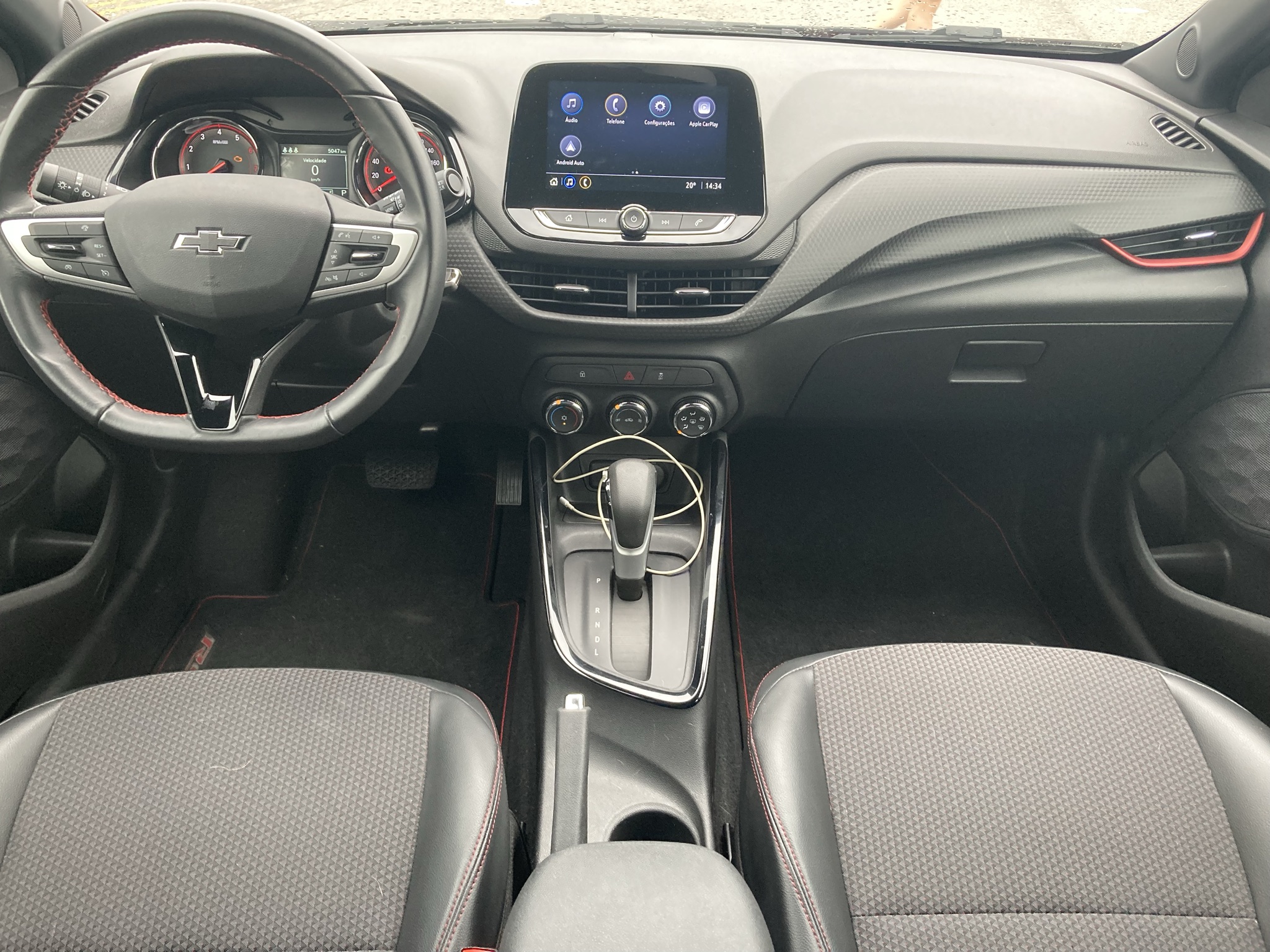Por dentro, a cabine do Chevrolet Onix RS 2022 é toda escurecida. Alguns detalhes em vermelho no acabamento quebram o tom escuro e casam bem com o visual do carro.