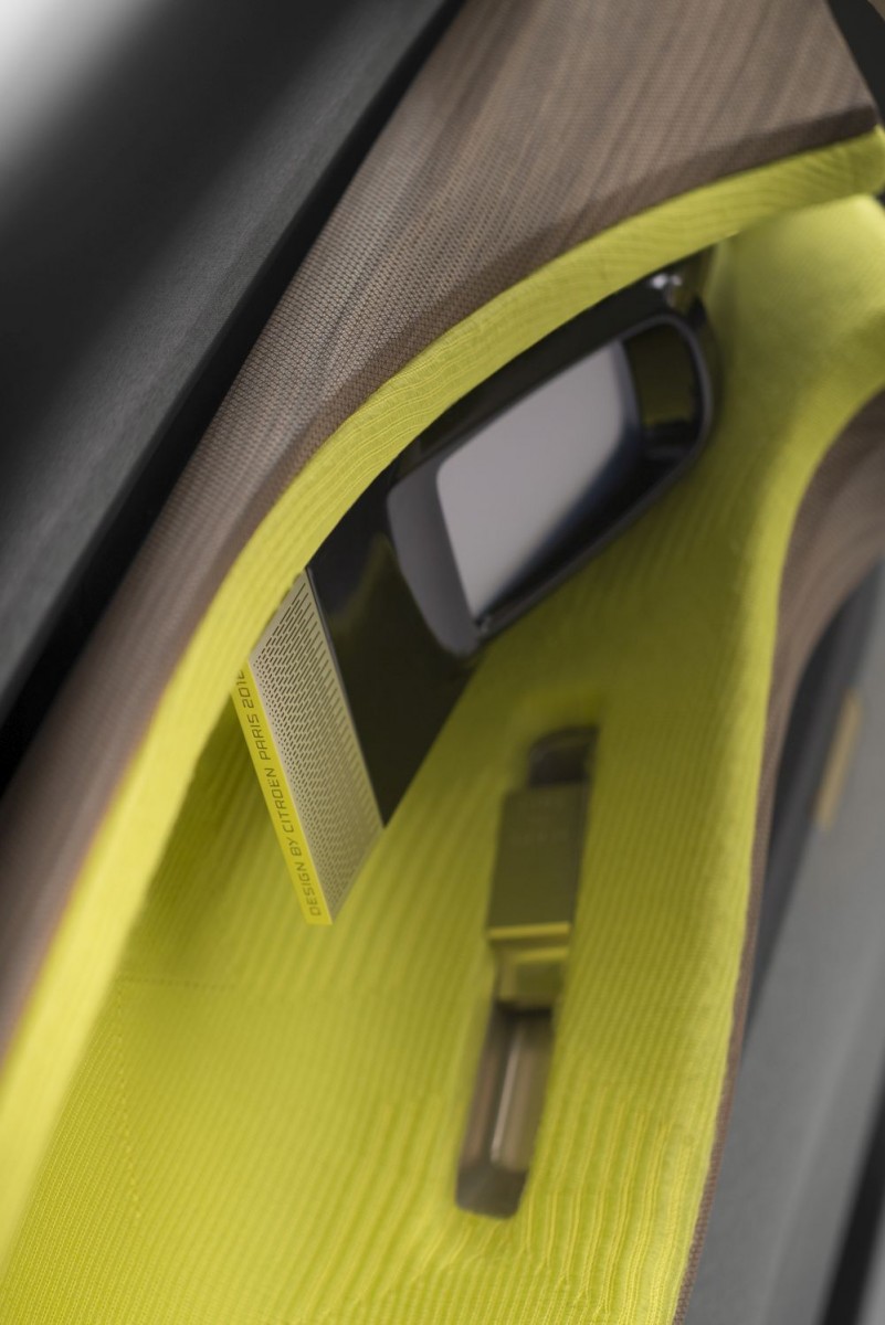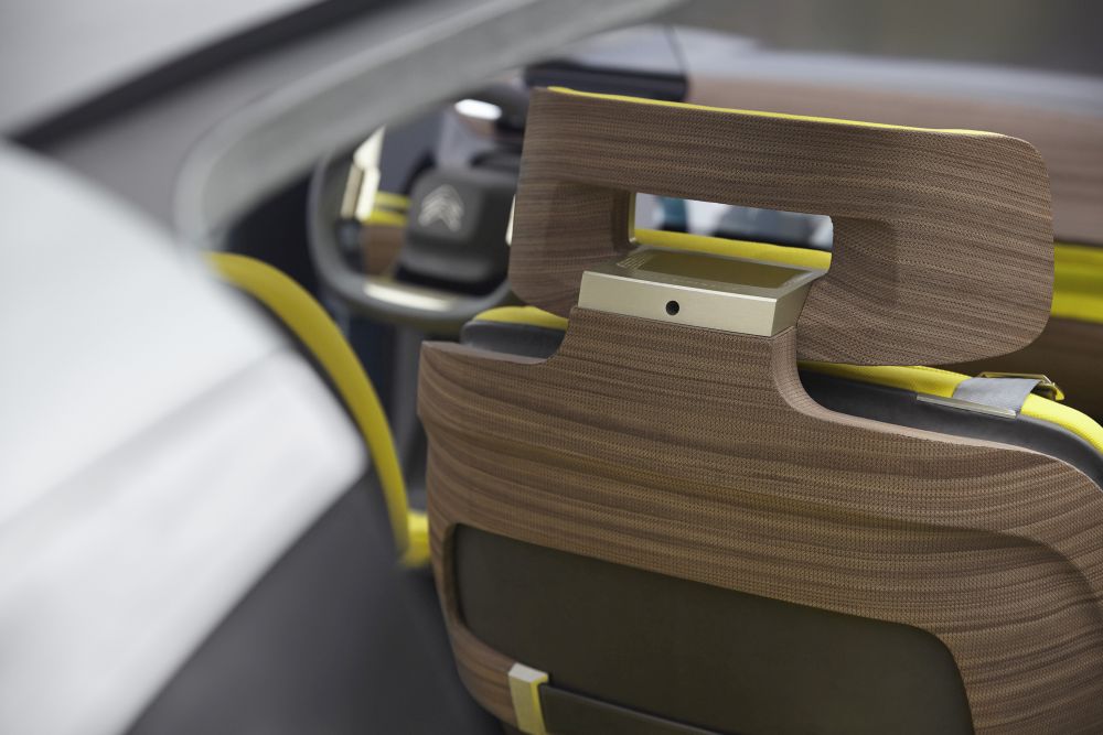 Na parte interna, a Citroën se inspirou em três fundamentos; arquitetura, decoração e mobiliário. Pintado em um tom cítrico de amarelo mesclado com detalhes em madeira, o painel do veículo se une às partes laterais das portas. Chama a atenção a tela de 19 polegadas no centro da peça, além do volante de raio único, que faz referência a modelos clássicos da marca como o DS original.