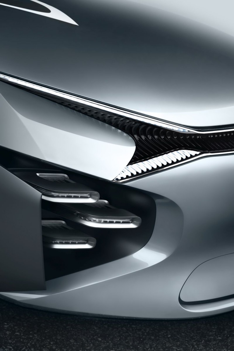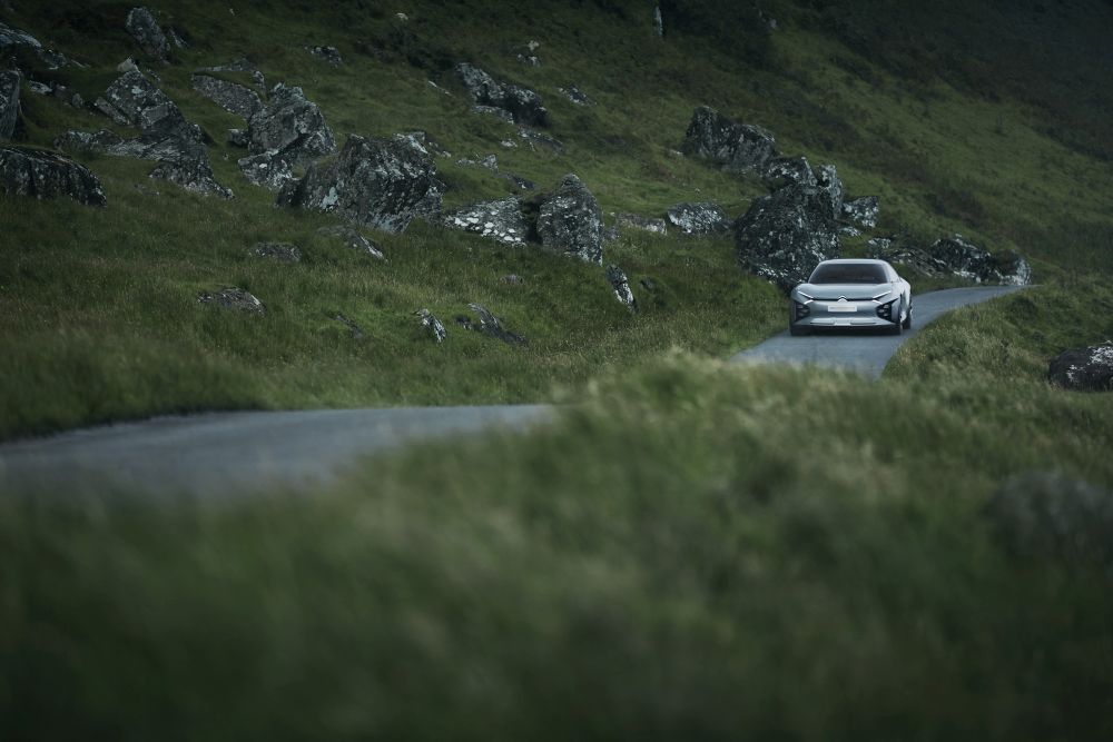 O teto baixo, com apenas 1,37 m de altura, reforça o cuidado que a fabricante teve com a aerodinâmica do conceito. Na dianteira, chama a atenção os chevrons, famoso logotipo da Citroën, que se encontram com os faróis diurnos (DRL) na extremidade da carroceria. Abaixo, composto por três conjuntos em LED de cada lado, estão os faróis direcionais.