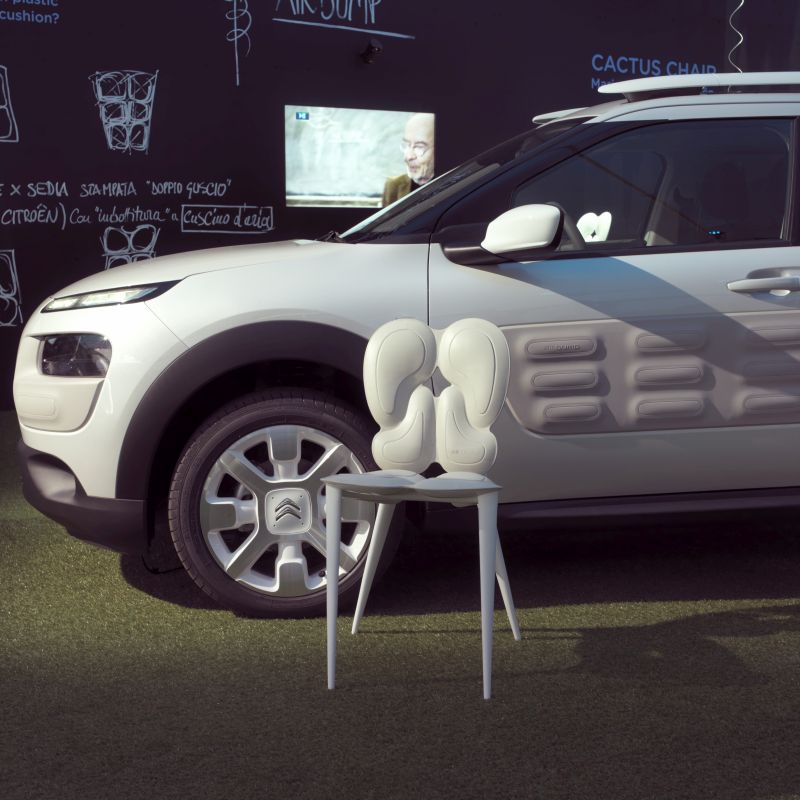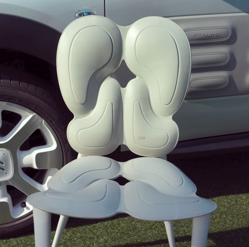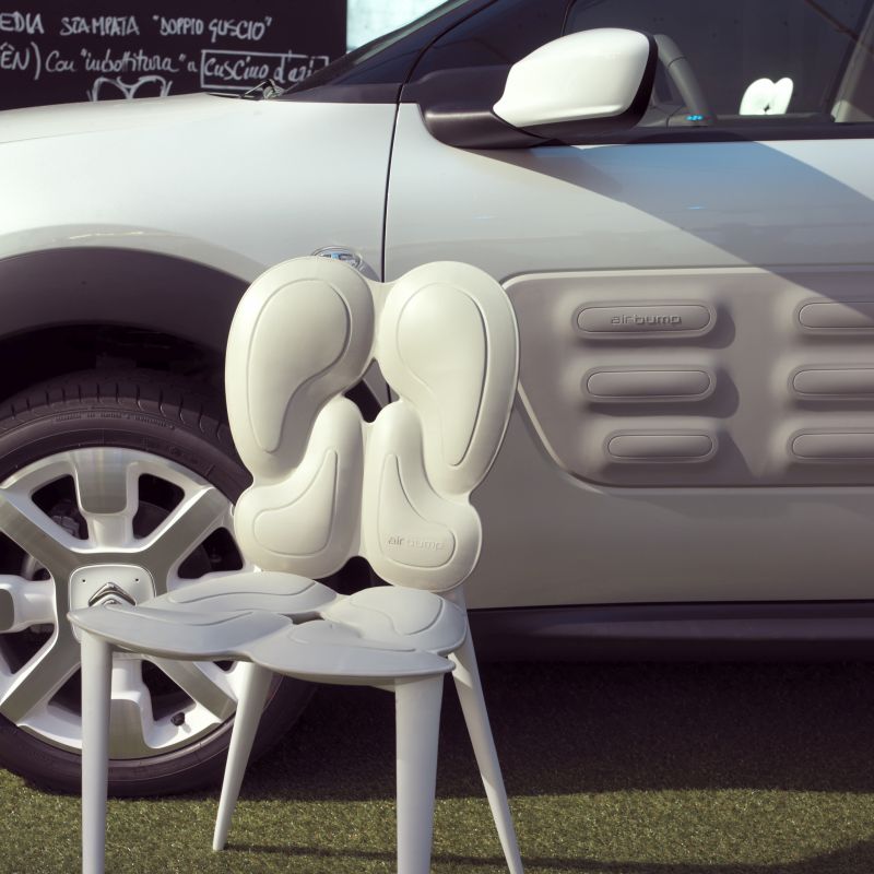 “Quando, um dia, a Citroën Itália me apresentou a sua tecnologia Airbump, a primeira ideia que tive ao tocá-la foi: por que não imaginr uma nova cadeira que teria a mesma leveza do que uma cadeira de plástico, lhe oferecendo o conforto de um verdadeiro enchimento?” explica Bellini.