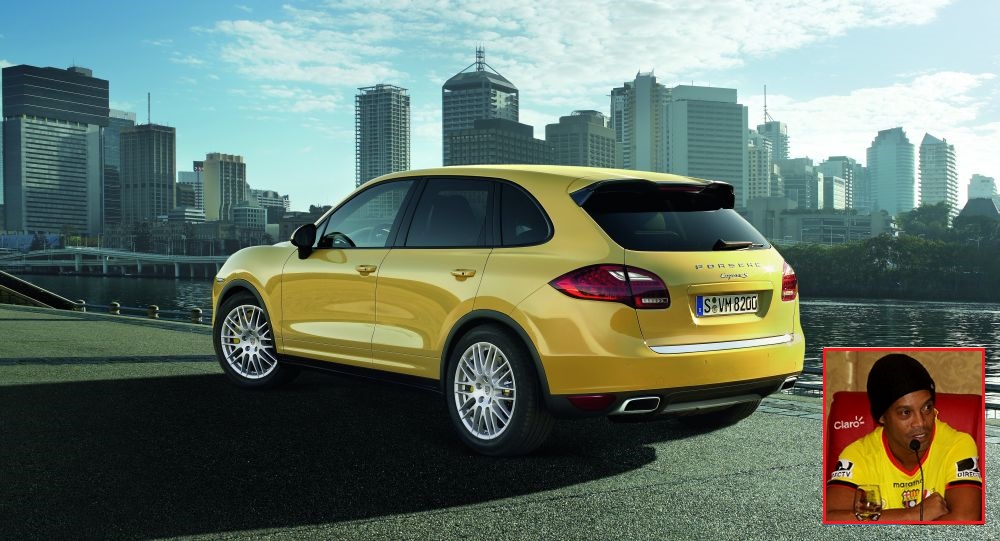 - Ronaldinho Gaúcho – Porsche Cayenne: em 2012, quando ainda jogava pelo Atlético Mineiro, o o atacante colidiu com um Chevrolet Chevette na região da grande Belo Horizonte; nem o atleta e nem os ocupantes do outro veículo sofreram ferimentos grave |Foto: Divulgação Porsche/ FCA: Corporate via Visualhunt.com / CC BY-NC-ND / Por Agencia de Noticias ANDES (RONALDINHO GAÚCHO) [CC BY-SA 2.0], undefined