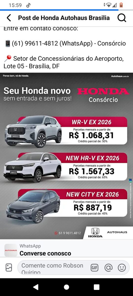 A principal vantagem do consórcio, segundo Guilherme , é a possibilidade de adquirir um Honda novo “sem entrada e sem juros”. No entanto, ele ressalta que o modelo é voltado para quem não tem pressa imediata: “O consórcio vale a pena caso você queira planejar a compra. Trabalhamos com planejamento estratégico”.