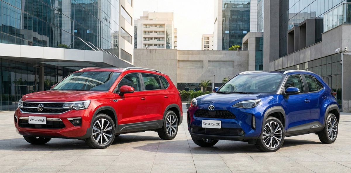 VW Tera High vs Toyota Yaris Cross XR. Comparamos preços oficiais de 2026, motorização, espaço e itens de série para você decidir