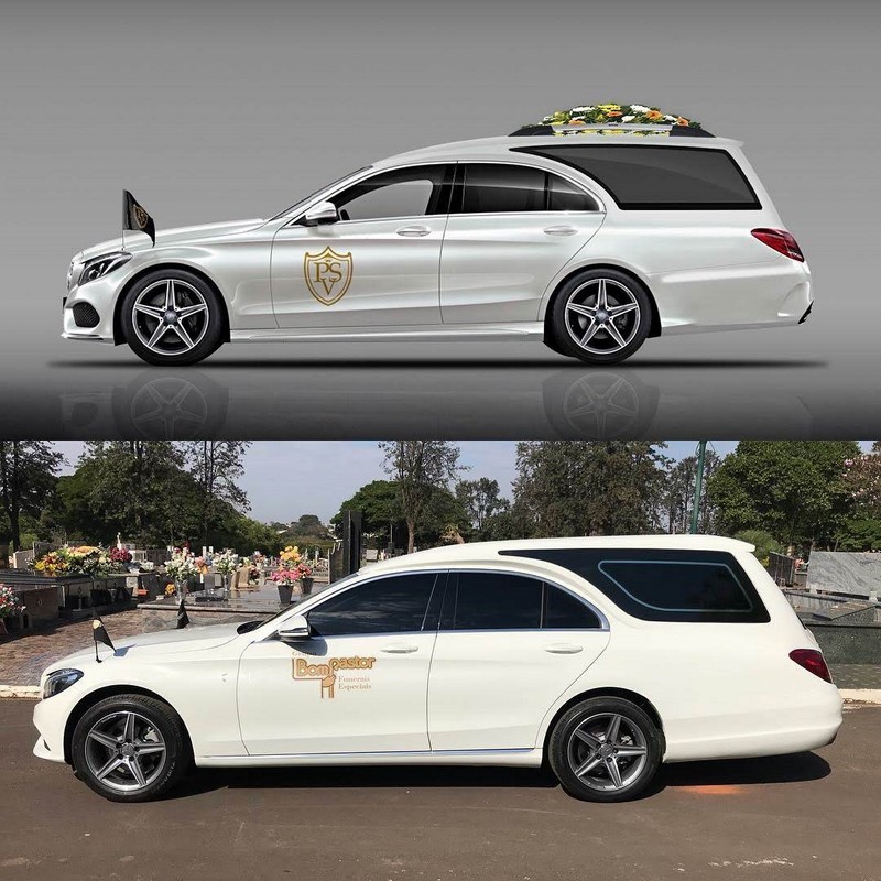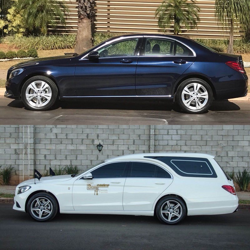 - Comparação entre um modelo convencional da Mercedes-Benz C180 e a versão funeral da Procópio |Foto: Divulgação