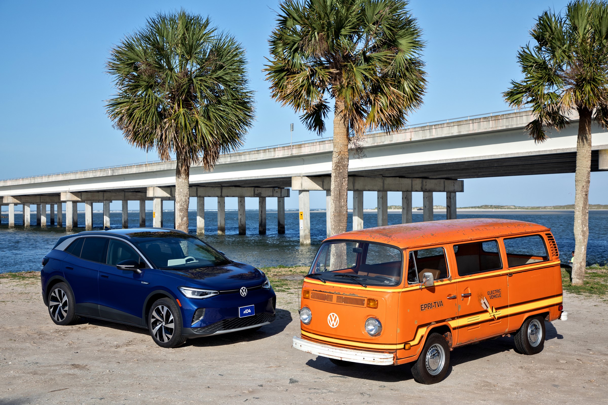 - VW ID.4 e a VW Elektrotransporter; presente e passado dos carros elétricos |Foto: Divulgação/VW