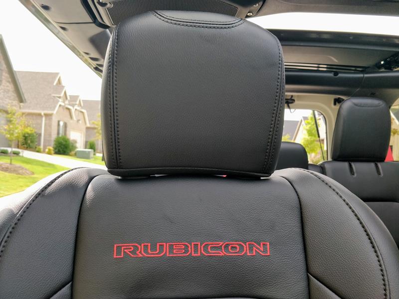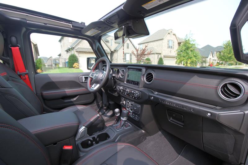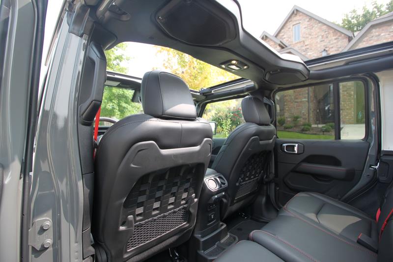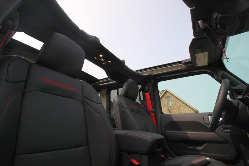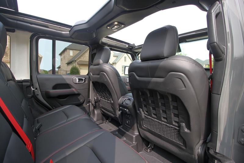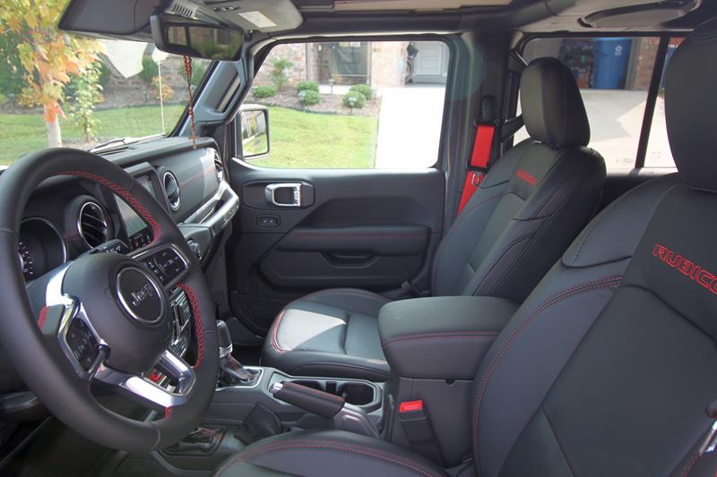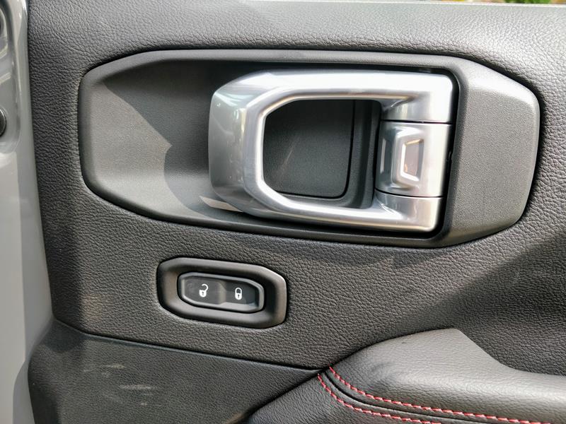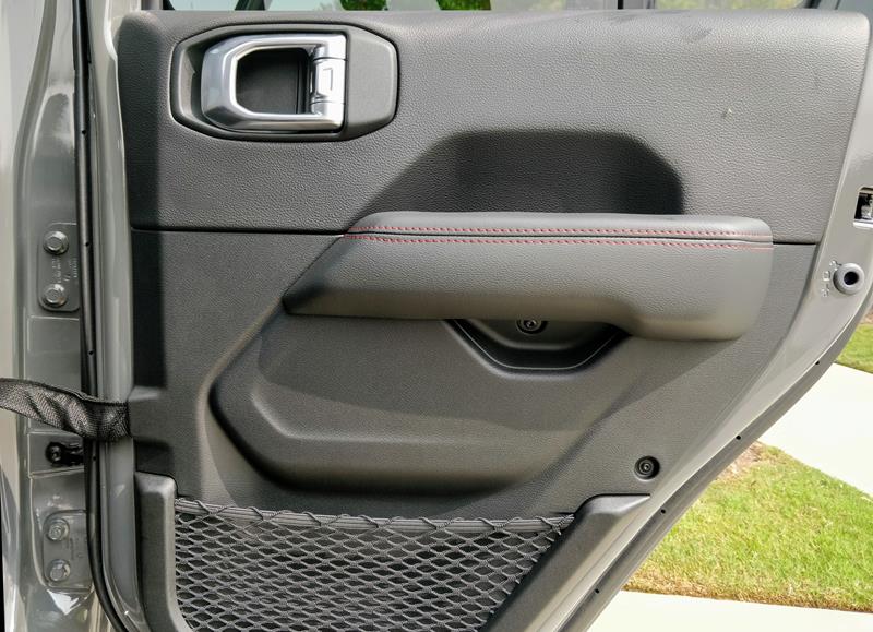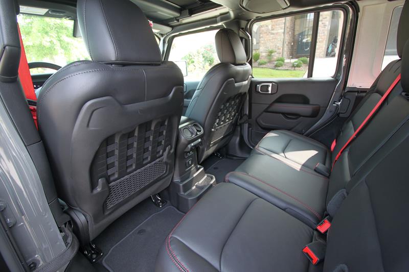 A versão testada trazia ainda banco de couro preto com detalhes em vermelho – dentre eles algumas costuras, a palavra Rubicon estampada nos assentos dianteiros e os cintos de segurança. Chamou atenção o fato de o ajuste dos bancos da frente se dar de maneira simples, com alavancas de tecido e catracas manuais.