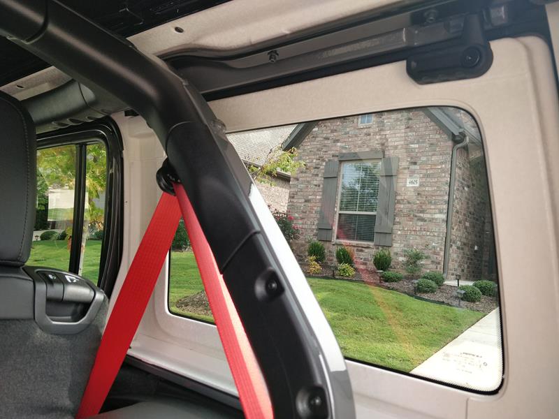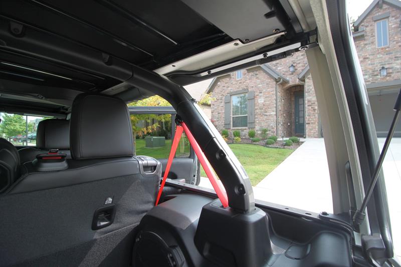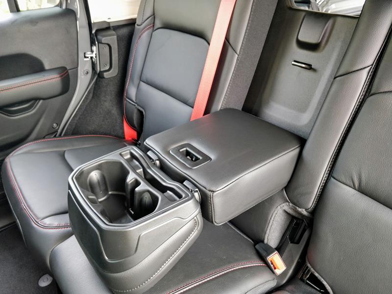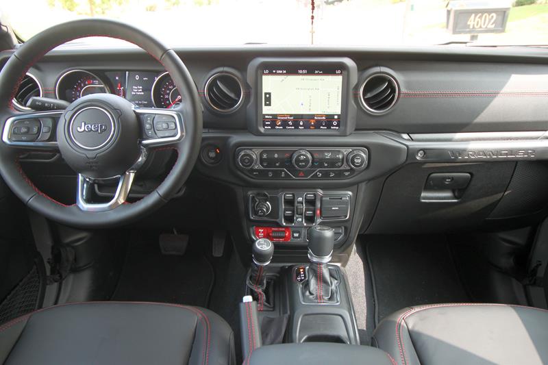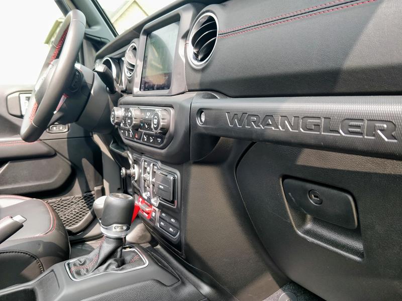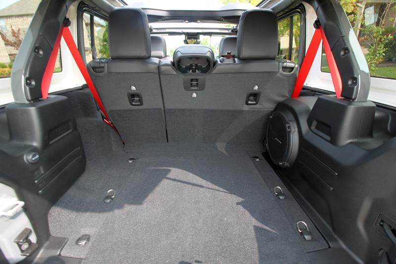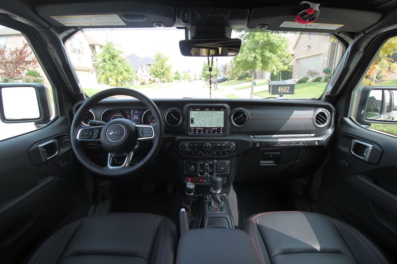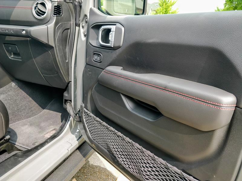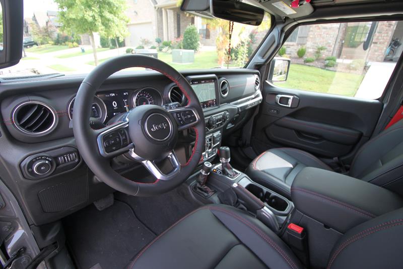 A versão testada trazia ainda banco de couro preto com detalhes em vermelho – dentre eles algumas costuras, a palavra Rubicon estampada nos assentos dianteiros e os cintos de segurança. Chamou atenção o fato de o ajuste dos bancos da frente se dar de maneira simples, com alavancas de tecido e catracas manuais.