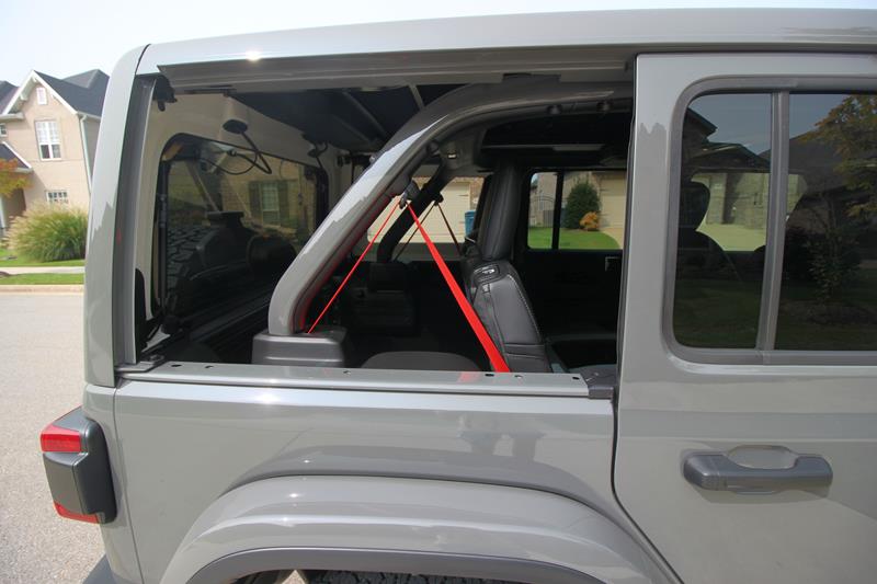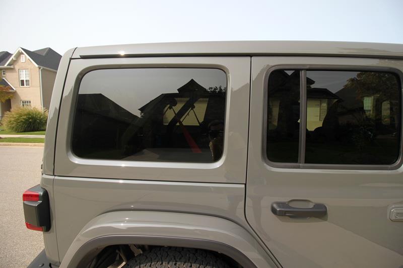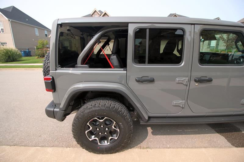 Para despir um pouco mais o Wrangler, basta soltar com as mãos (é tão fácil quanto girar uma maçaneta) as duas presilhas que sustentam cada uma das janelas laterais traseiras – dá até para armazená-las em segurança no porta-malas dentro de um saco de proteção oferecido como opcional. Ou, ainda, usar o conjunto de ferramentas que acompanha o modelo para desparafusar as portas sem esforço e sair peladão por aí (o carro, veja bem).