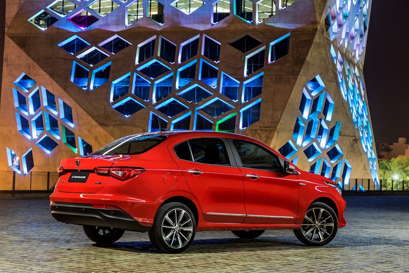 Principal diferencial de um três volumes, o porta-malas do Cronos conta com 525 litros de capacidade. Já o desenho traz algumas diferenças em relação ao Argo, como na grade, para-choque e capô. A traseira, por sua vez, teve como fonte de inspiração para as lanternas o Fiat Tipo italiano.