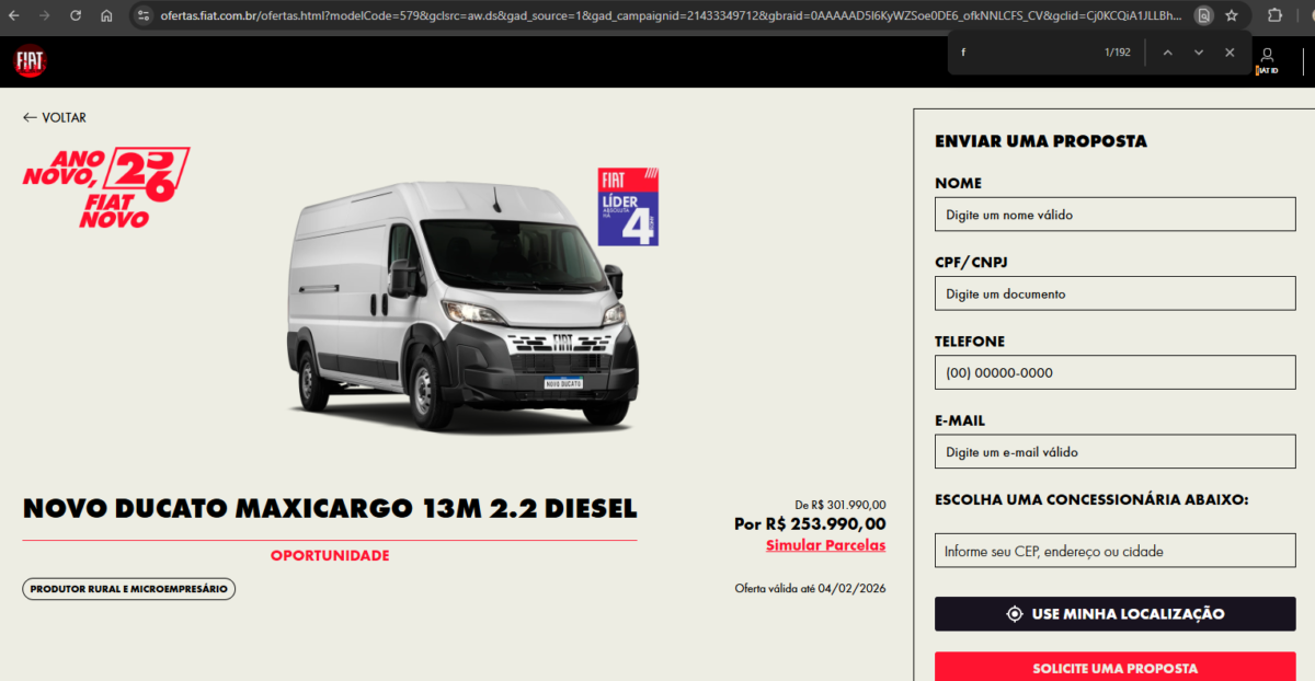 A Fiat anunciou uma ofensiva agressiva para o setor de transportes neste início de ano. O Novo Ducato Maxicargo 13m³, ano-modelo 2026, está com uma condição de venda direta que reduz seu preço original de R$ 301.990 para R$ 253.670 — um desconto de mais de R$ 48 mil exclusivo para produtores rurais e microempresários (CNPJ).