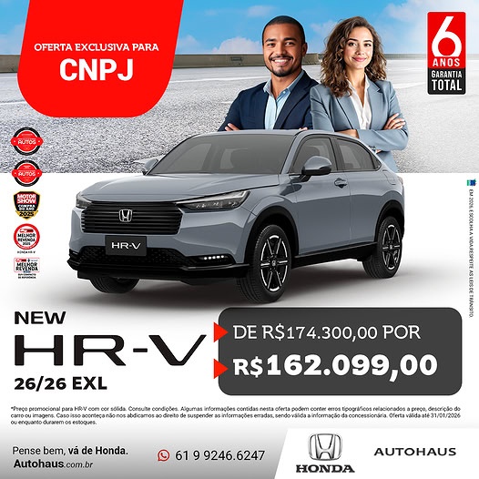 O mercado corporativo acaba de ganhar um incentivo de peso no início de 2026. A concessionária Autohaus anunciou uma oferta agressiva para o New HR-V EXL, focada exclusivamente em vendas diretas para portadores de CNPJ.
