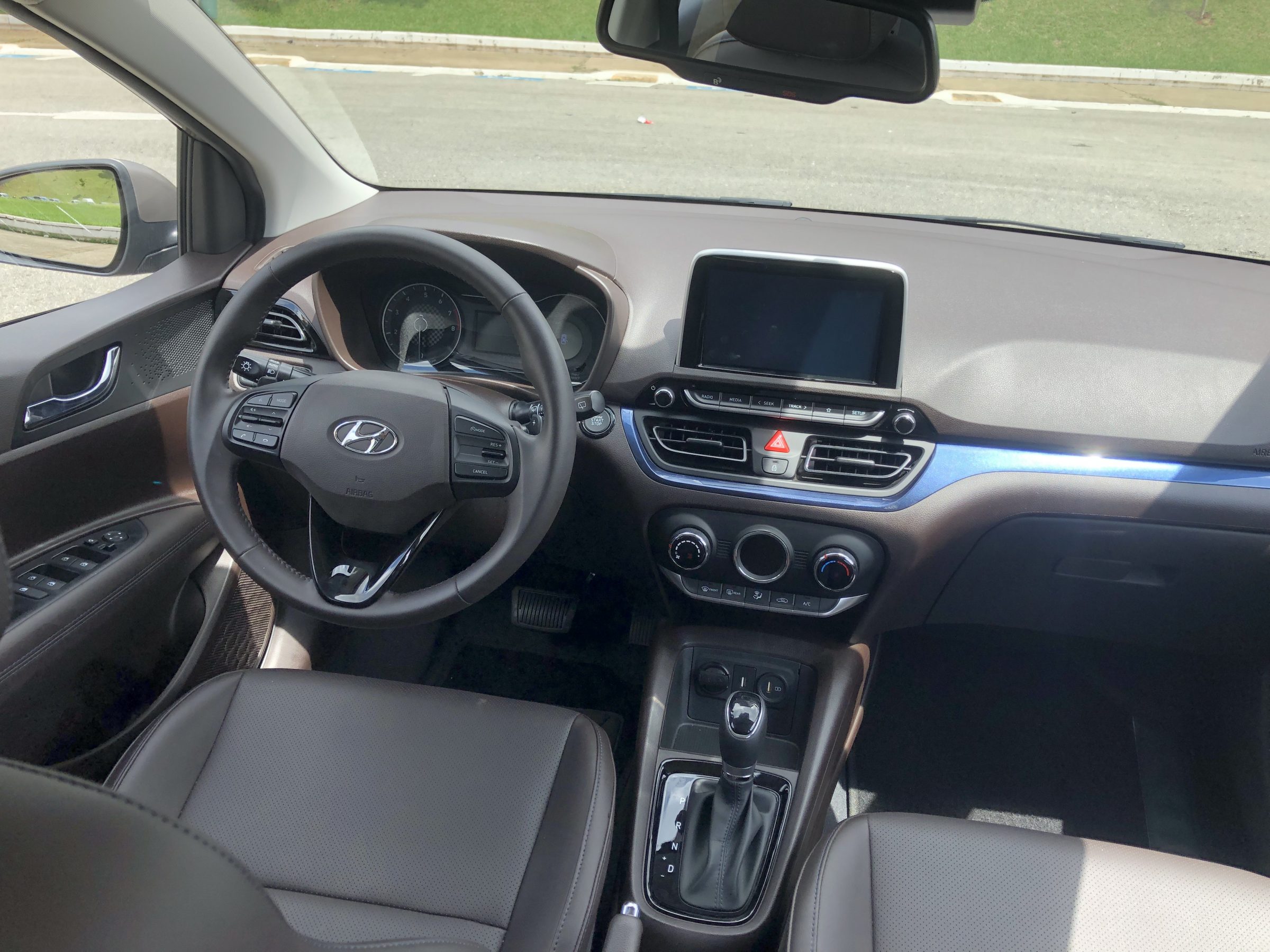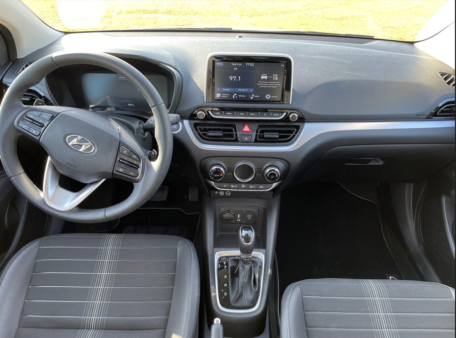 Exclusivamente para o HB20 Hatch Platinum Plus, os bancos contam com uma mistura de couro e tecido pretos com outros elementos revestidos em couro, como o volante, manopla, apoio de braço no console central e acabamento das portas.