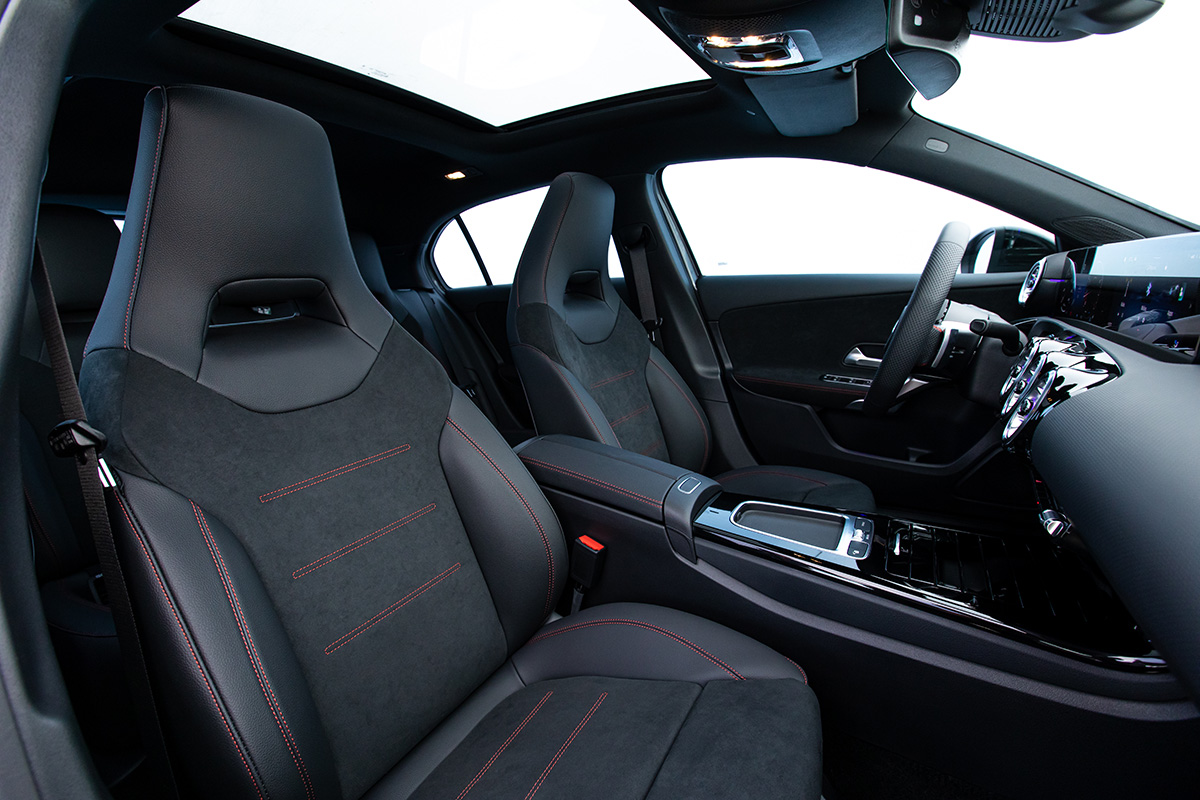 No interior, a exclusividade do A 200 AMG Line se reflete na tela dupla independente de 10,25 polegadas, que parecem flutuar sobre o painel frontal. A arquitetura interna cria um ambiente acolhedor com iluminação especial.