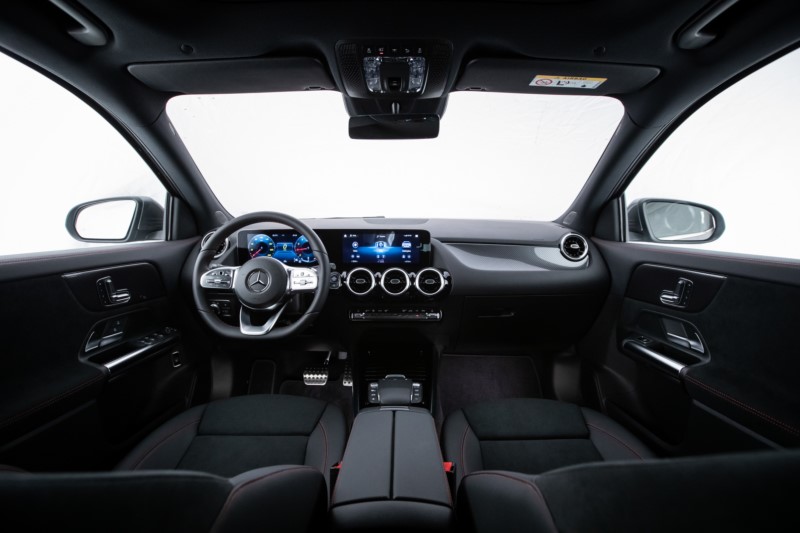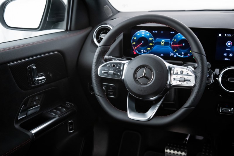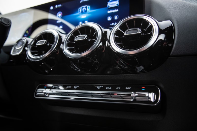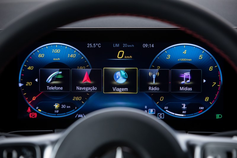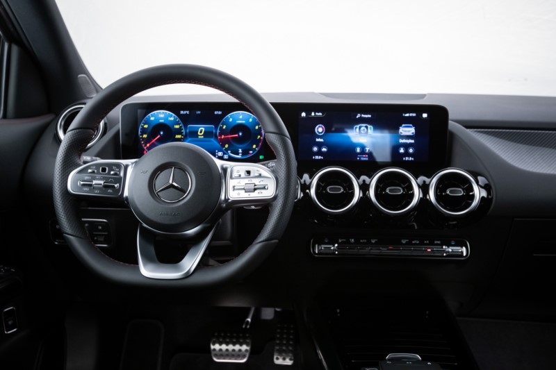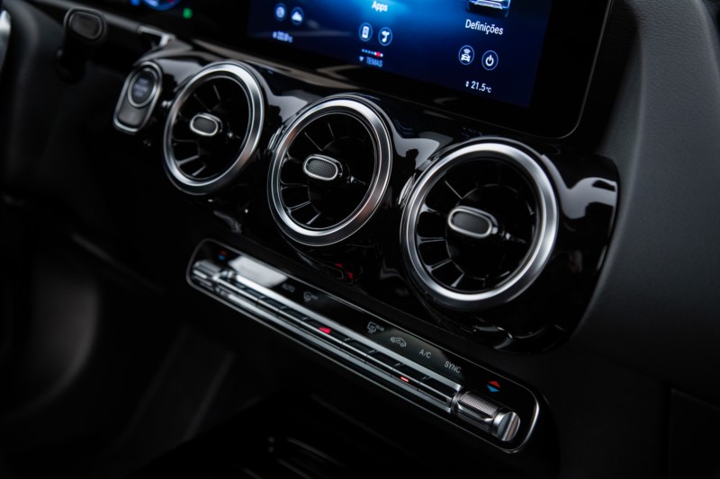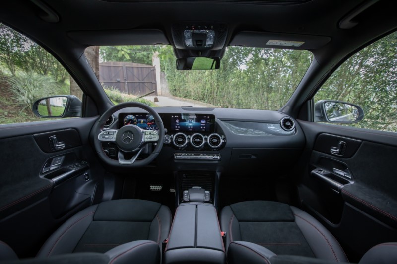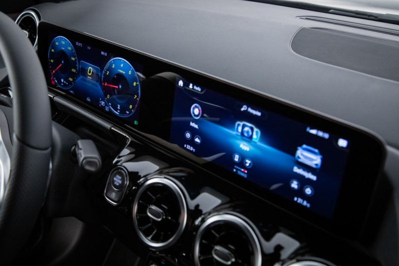 O GLA 200 AMG Line conta com as duas telas de 10,25 polegadas no painel, sendo uma para o painel de instrumentos personalizável e outra para o console central. Elas são integradas ao sistema MBUX, que permite realizar comandos por voz.