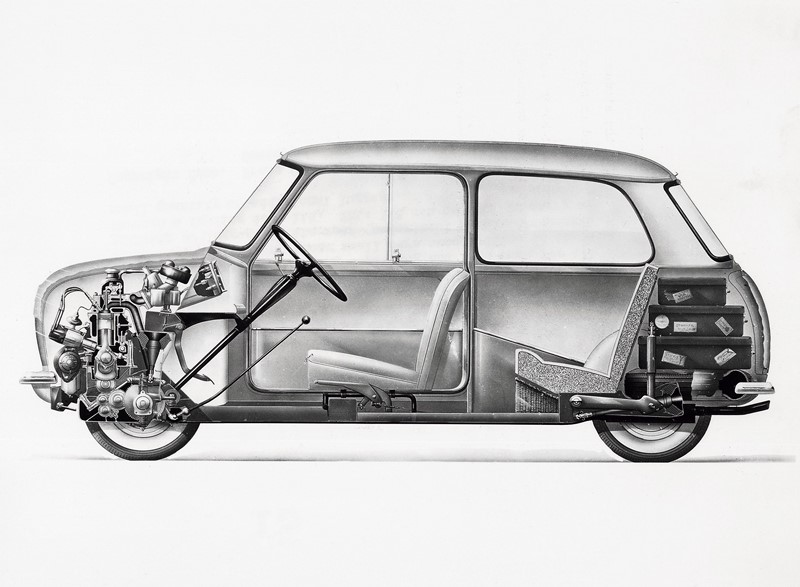 A primeira geração do Mini revolucionou por ser um carro pequeno, mas com espaço para quatro pessoas. Além disso, ele foi o primeiro automóvel a utilizar um motor dianteiro transversal. Ele tinha 3,05 m de comprimento, 1,41 m de largura e 1,35 m de altura. Seu peso era de 570 kg. Econômico, podia fazer até 20 km com um litro de gasolina.