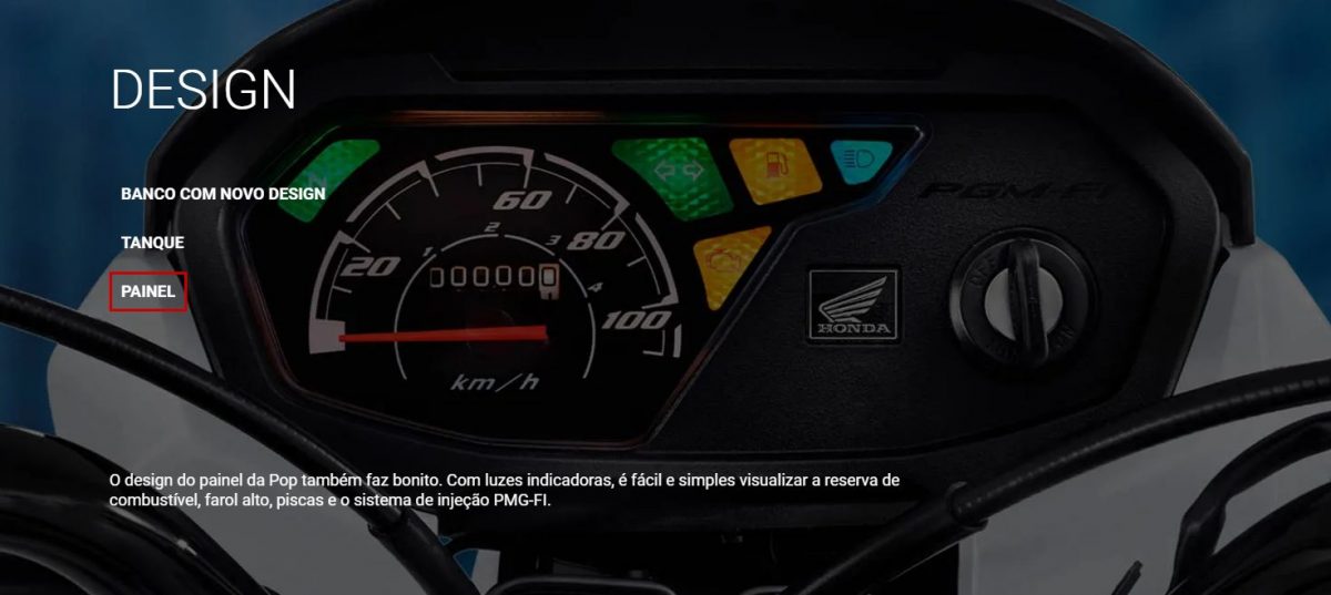 Conforme já mencionado, a Honda Pop 110i permanece com seu design limpo, porém, arrojado, moderno e urbano. A nova street, em termos de visual, tem como destaque o novo painel.