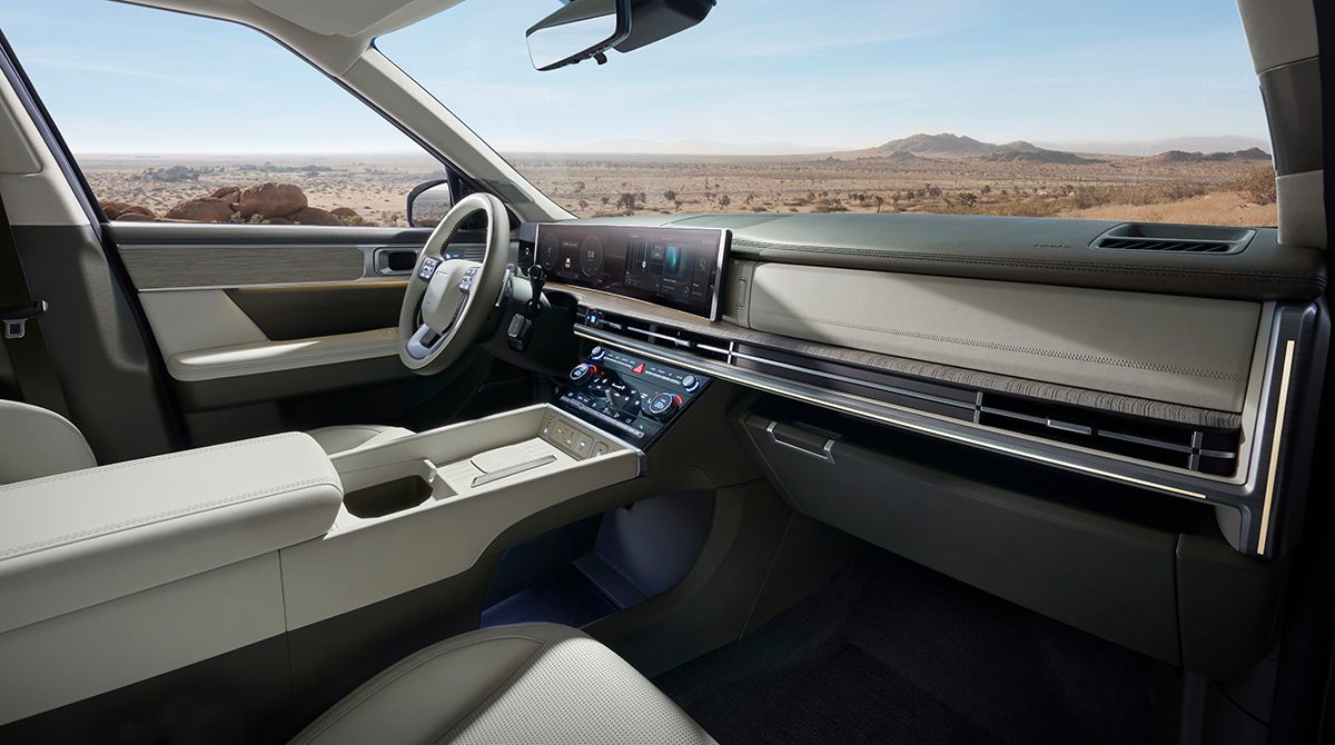 O primeiro display curvo panorâmico do Santa Fe, que engloba o painel de instrumentos digital de 12,3 polegadas e o sistema de infoentretenimento, melhora a visibilidade do motorista e cria uma sensação de luxo.