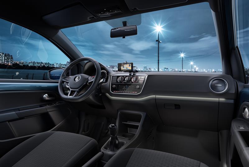 Internamente, o novo up! também foi reformulado. No painel de instrumentos, o motorista acompanha as informações do veículo por meio de três mostradores circulares. A tela com iluminação branca e o velocímetro ficam na parte central, o conta-giros fica à esquerda e o marcador do nível de combustível à direita.
