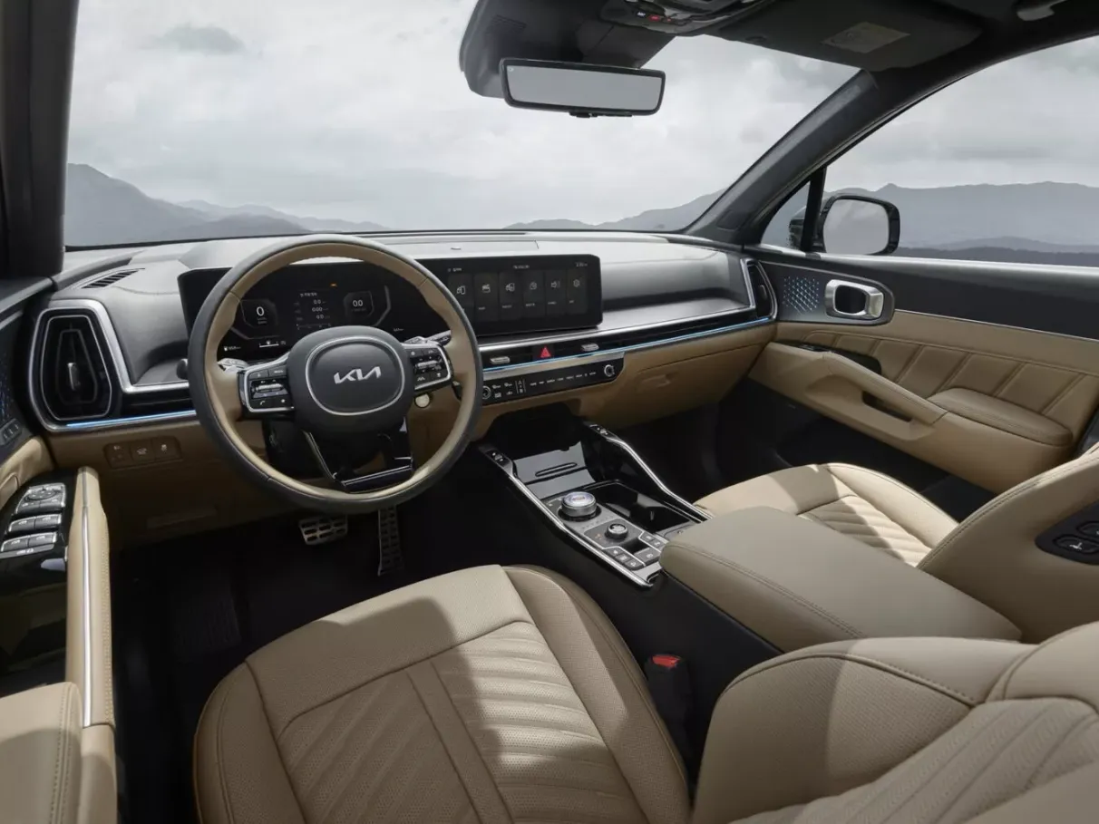 Visualmente, o SUV adota a nova identidade da Kia, com grade tridimensional e faróis em LED verticais com assinatura em “Y”. As rodas de liga leve são de 19 polegadas. Por dentro, o salto de qualidade é notável. O painel é dominado por duas telas curvas de 12,3 polegadas (uma para instrumentos, outra para multimídia).
