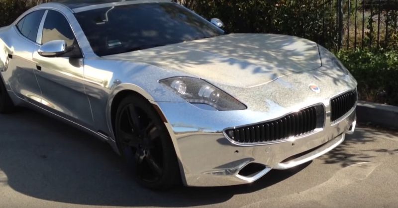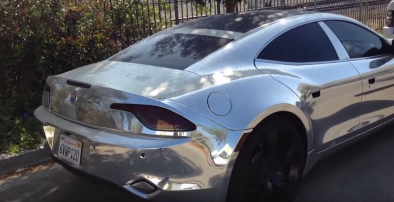 - O Fisker Karma de Justin Bieber também recebeu uma pintura diferenciada; o híbrido exibe uma pintura cromada muito chamativa |Foto: Reprodução/YouTube