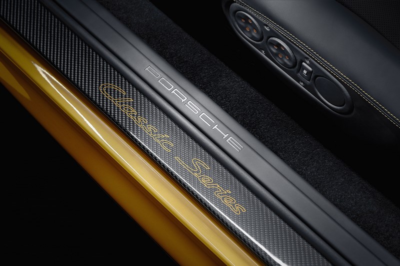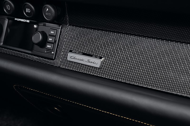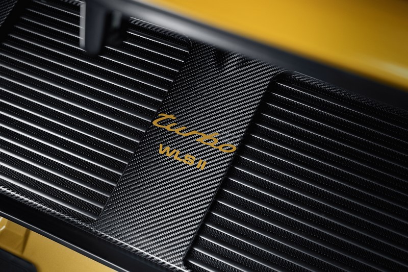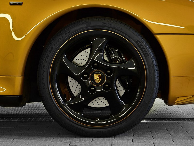 As rodas pretas também ganharam detalhes na cor da carroceria. Já os bancos e acabamento interno são pretos, com detalhes também em amarelo dourado. A carroceria traz as características tomadas de ar laterais do 993 Turbo que, em 1998, eram oferecidas como opcionais.