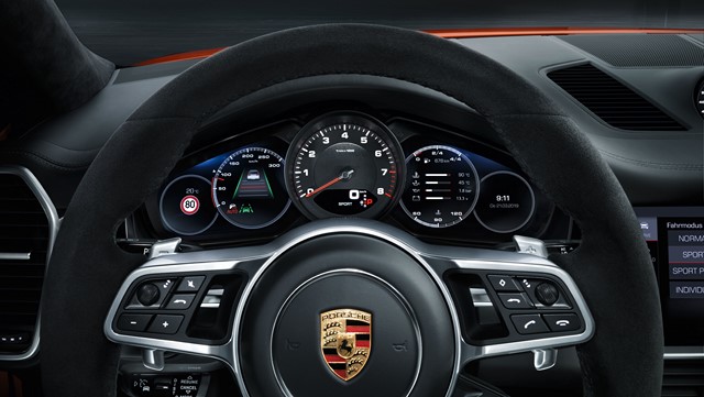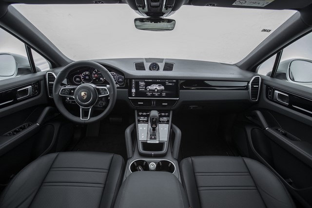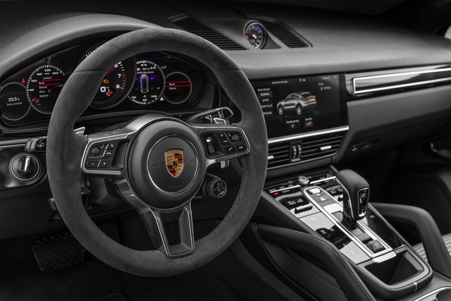 O efeito é reforçado por um defletor aerodinâmico no teto, que marca ainda mais a silhueta do Coupé. O para-brisa dianteiro e a coluna A são mais baixos do que no Cayenne, graças ao rebaixamento da borda do teto em torno de 20 milímetros.