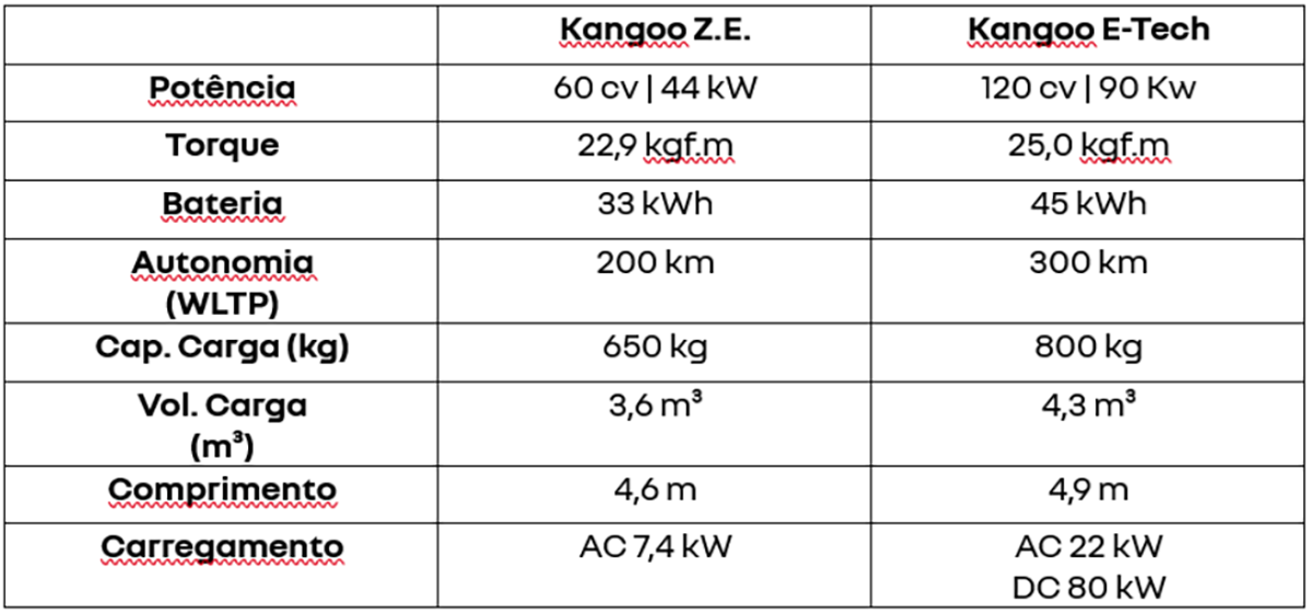 O novo Kangoo E-Tech 100% elétrico teve uma evolução notável em diversos aspectos, se comparado com a geração anterior Z.E. Maxi, como mostra a tabela abaixo: