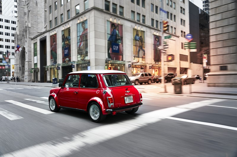 Para criar o MINI elétrico, a montadora pegou um exemplar antigo e fez uma restauração. O visual é fiel ao das versões Cooper da época, incluindo os alargadores de para-lamas e os faróis auxiliares. A pintura em vermelho com faixas brancas também remete ao modelo esportivo dos anos 1960. Apesar da mudança do propulsor, a fabricante inglesa garante que a dinâmica do veículo conserva as características do passado.