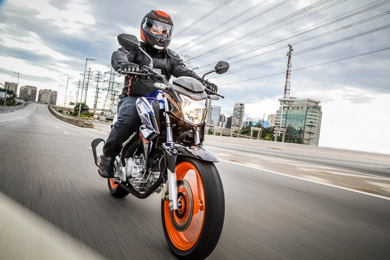 A carenagem pode ser pintada apenas com a cor Azul Perolizado, combinada com as rodas em laranja. Painel black-out com computador de bordo e a lanterna traseira em LED, assim como os piscas, complementam o visual da moto.