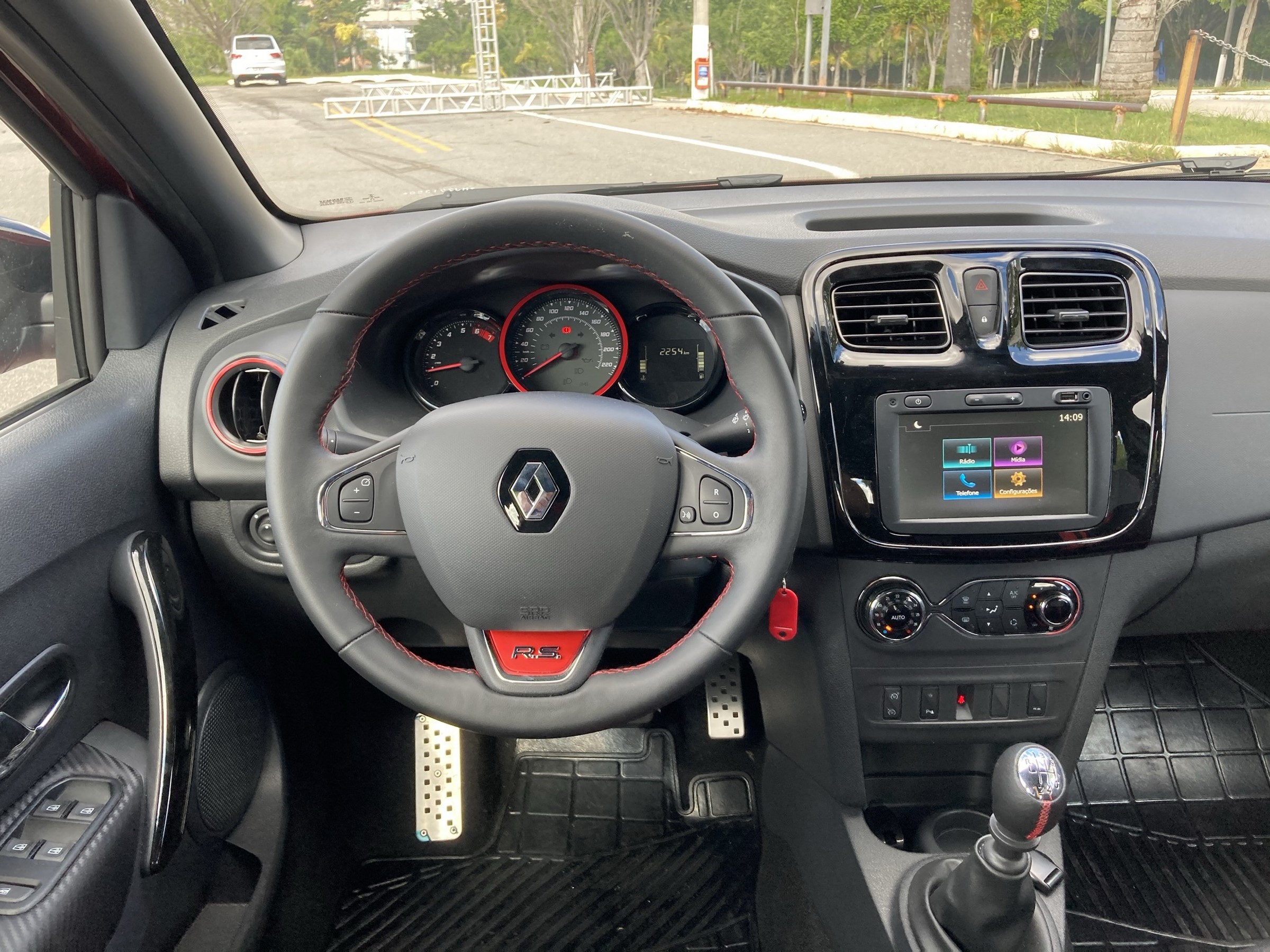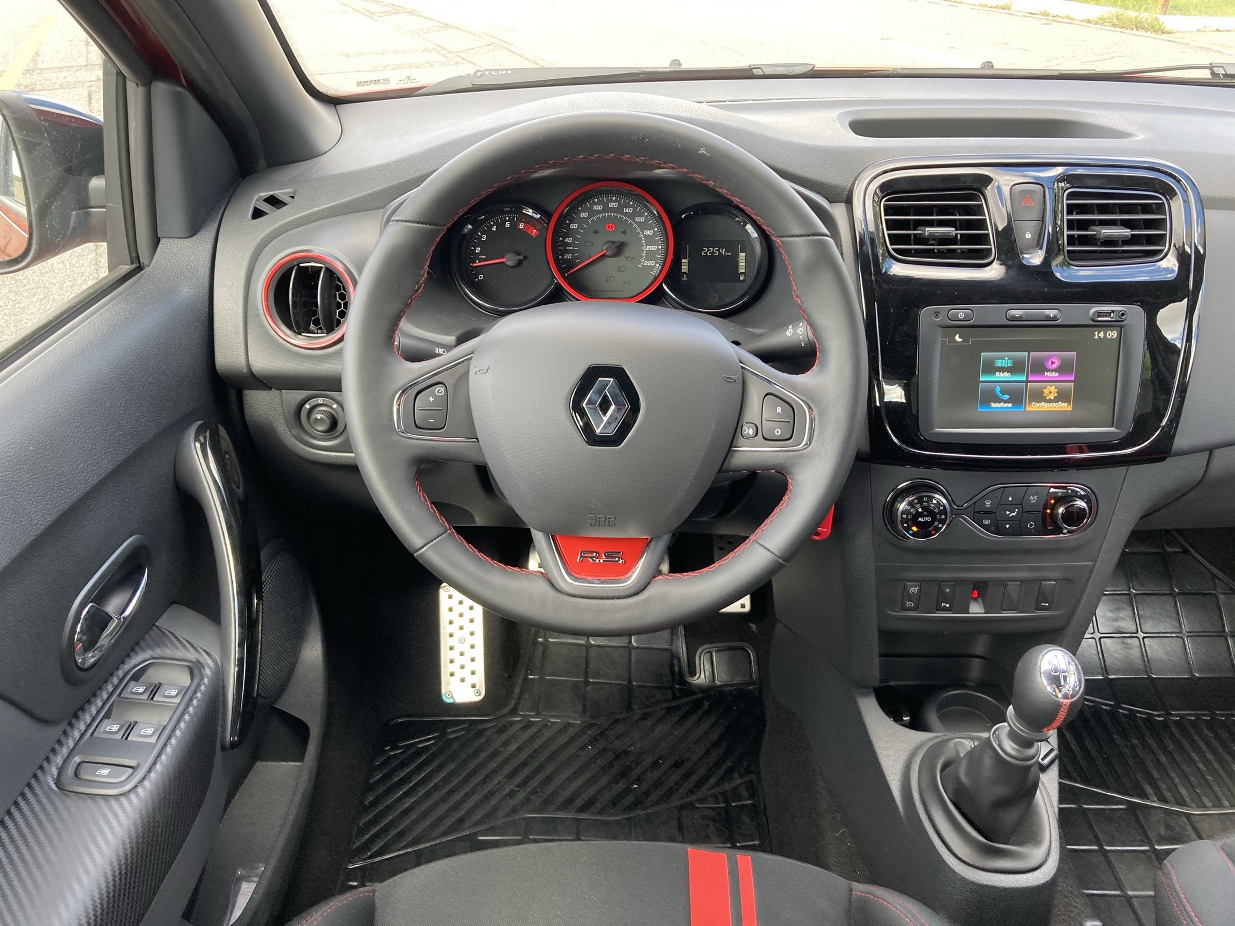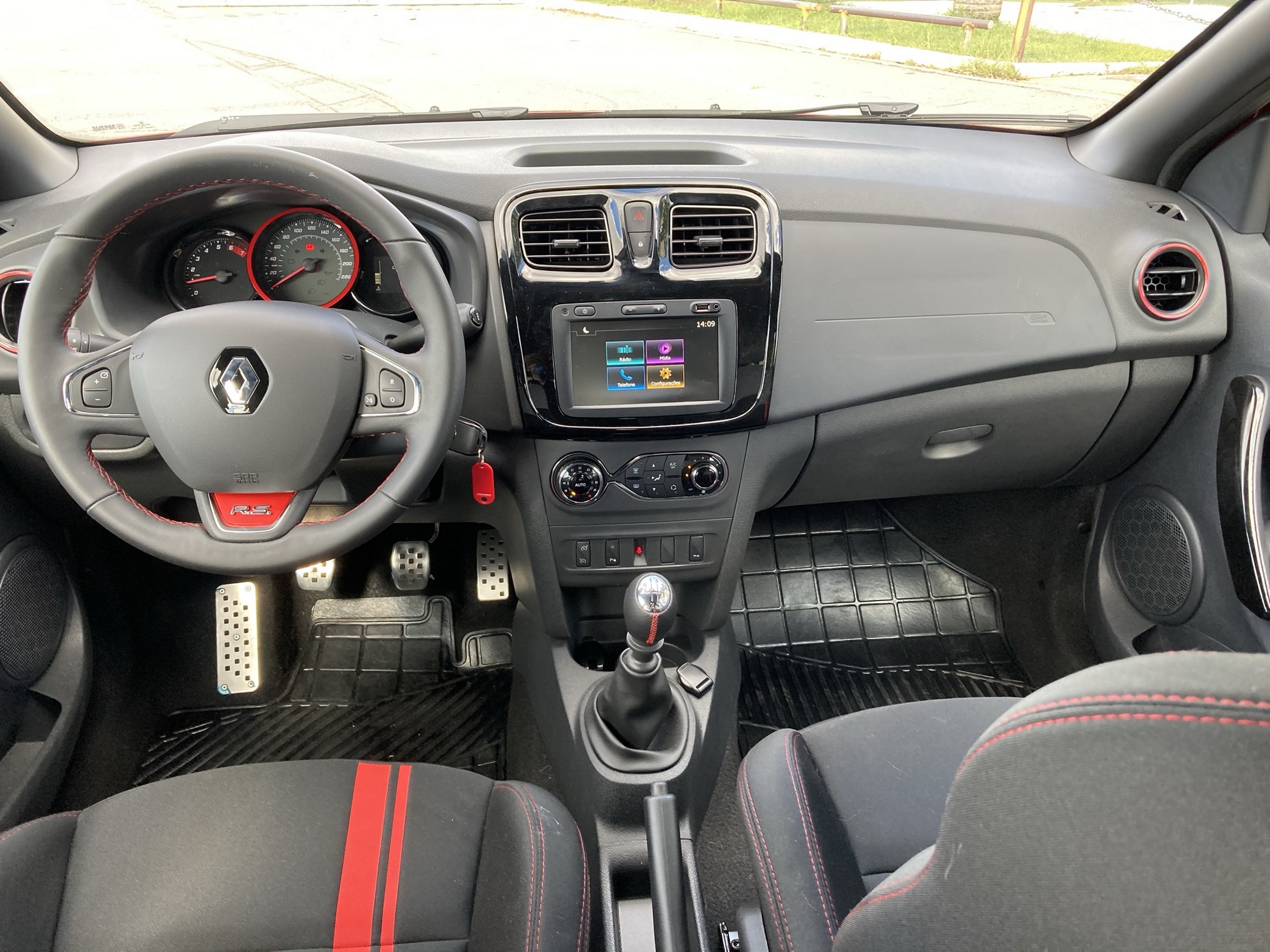 Dessa forma, a ergonomia do Sandero já não está no mesmo nível da encontrada em seus concorrentes mais modernos – nesse caso, entenda-se como concorrentes os hatches compactos em geral, já que nenhum deles conta com uma versão esportiva de fato. Um exemplo é a ausência de ajuste de profundidade do volante, bem como a posição da central multimídia Media Evolution de sete polegadas. Por falar nela, a própria central deixa um pouco a desejar, sendo bastante lenta ao utilizar.