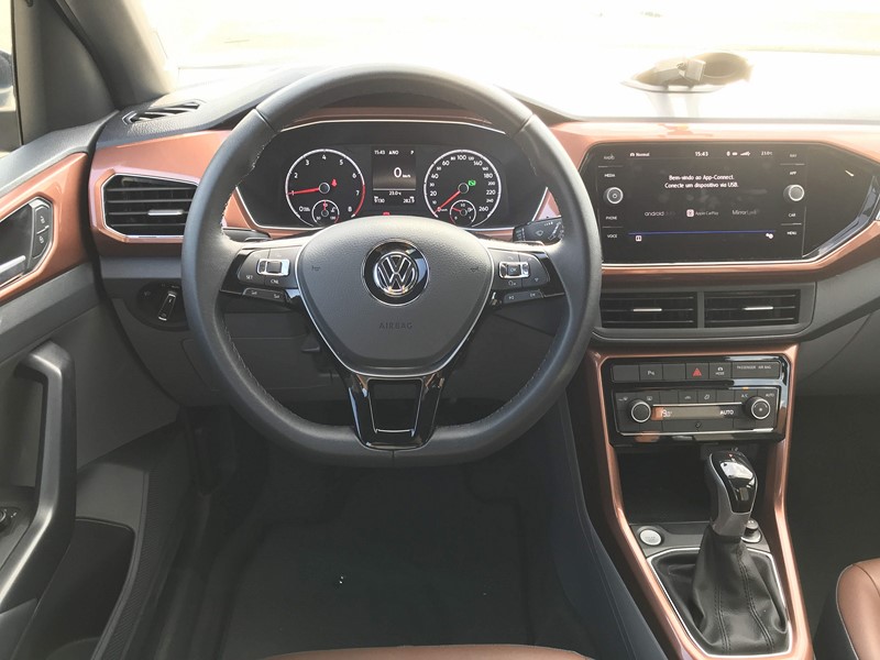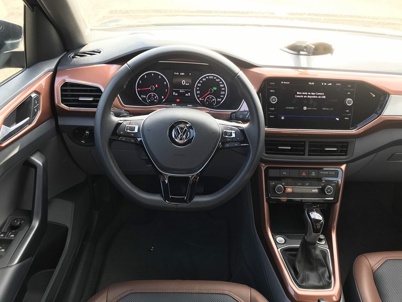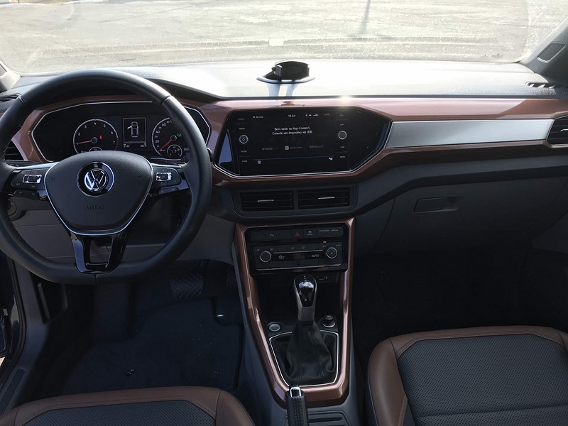 [/info_box]Equipamentos à parte, o T-Cross causou um certo déjà-vu no primeiro contato. Seu interior é semelhante ao utilizado na dupla Polo/Virtus, embora seja mais bem acabado. Por derivarem da mesma plataforma, não era de se estranhar que houvesse também o compartilhamento de alguns detalhes de cabine.