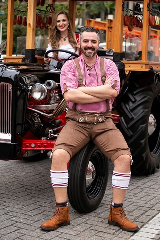 Trator histórico da Ford distribui chope e linguiça na Oktoberfest