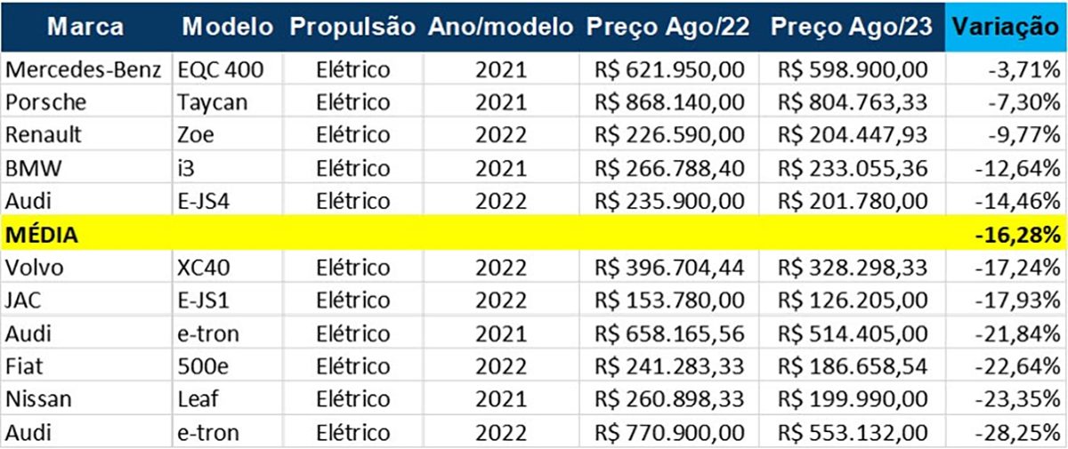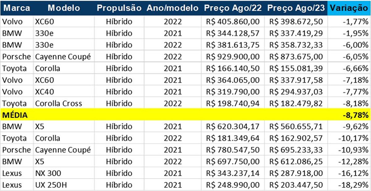 Por sua vez, os modelos elétricos puros não repetiram o êxito e desvalorizaram 16,28% – praticamente o dobro.