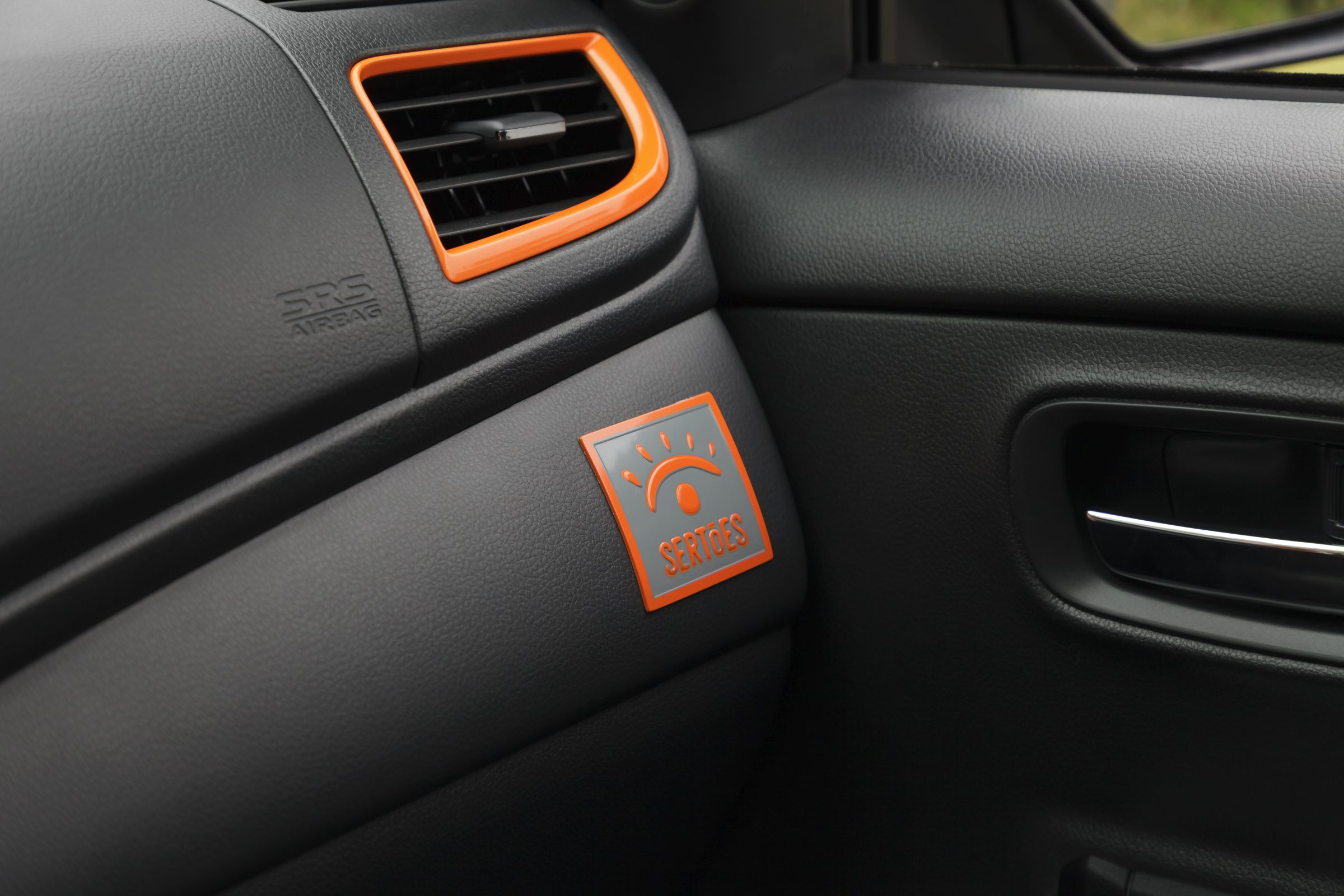 O painel central recebeu detalhes de acabamento também laranja brilhante assim como as saídas de ar e a moldura do sistema de transmissão. O contraste dos detalhes na cor laranja é evidenciado no revestimento das portas, na cor preta.