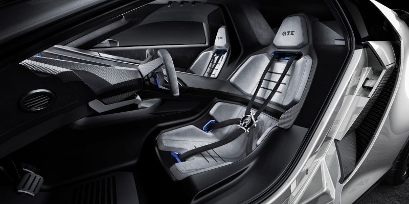 As portas do Golf GTE Sport são do tipo “asa de gaivota”, que abrem para cima. Ao entrar no carro, motorista e passageiro ficam em áreas completamente separadas. Os bancos em estilo concha são inspirados em modelos de competição. Eles são equipados com cintos de segurança de cinco pontos.
