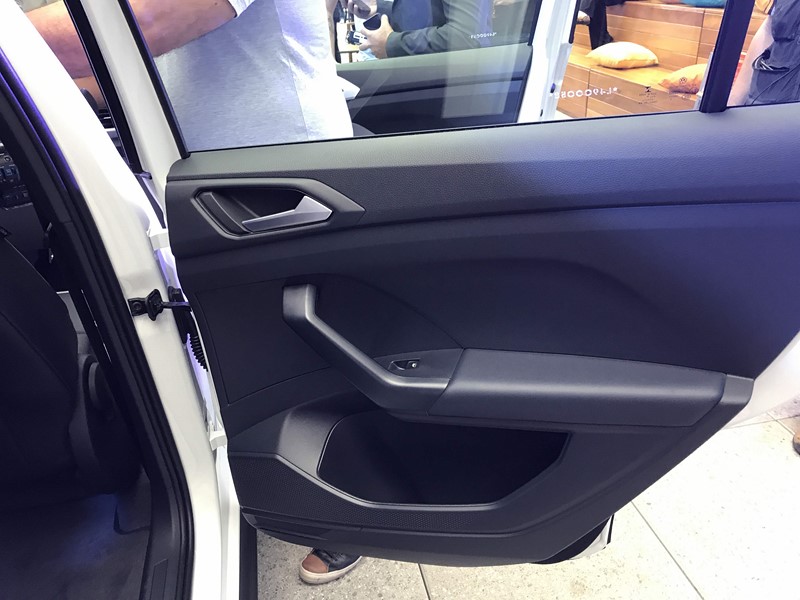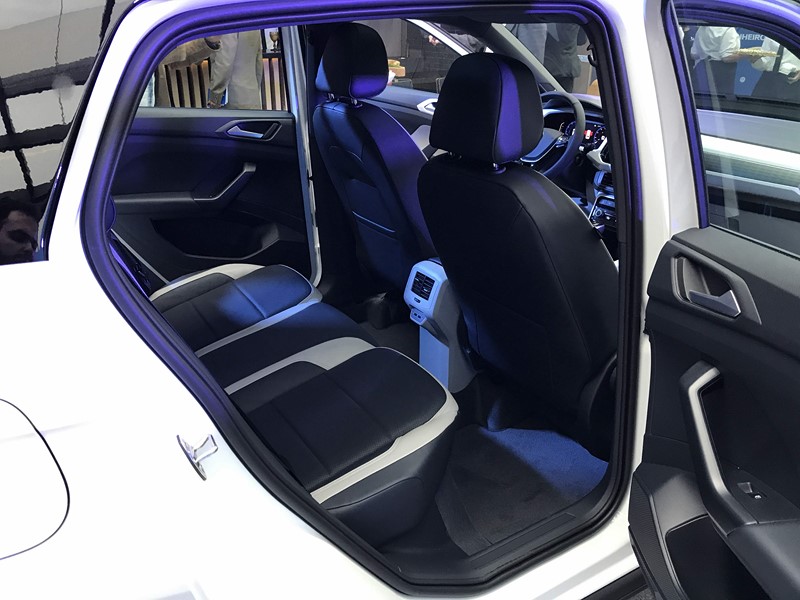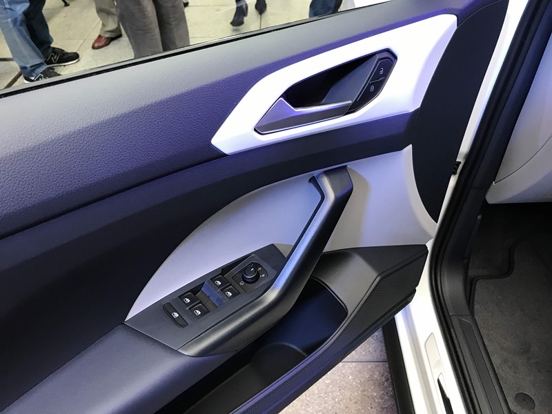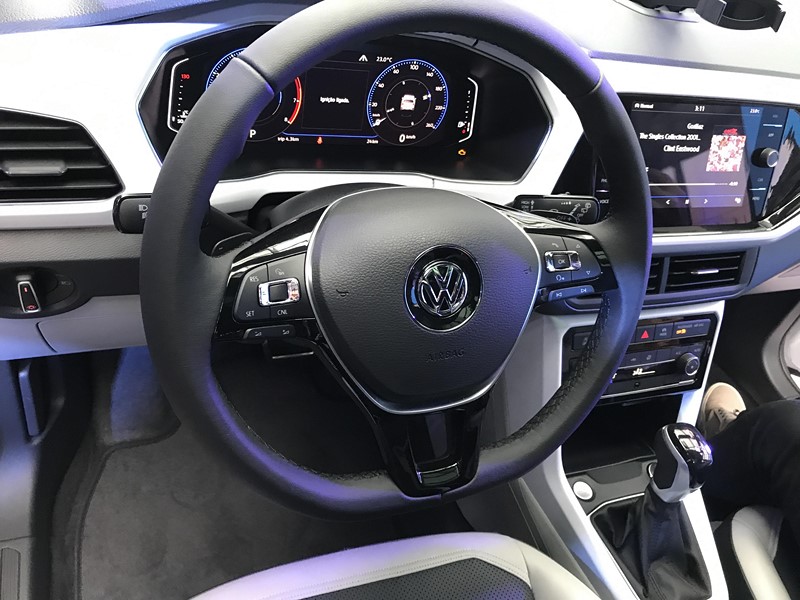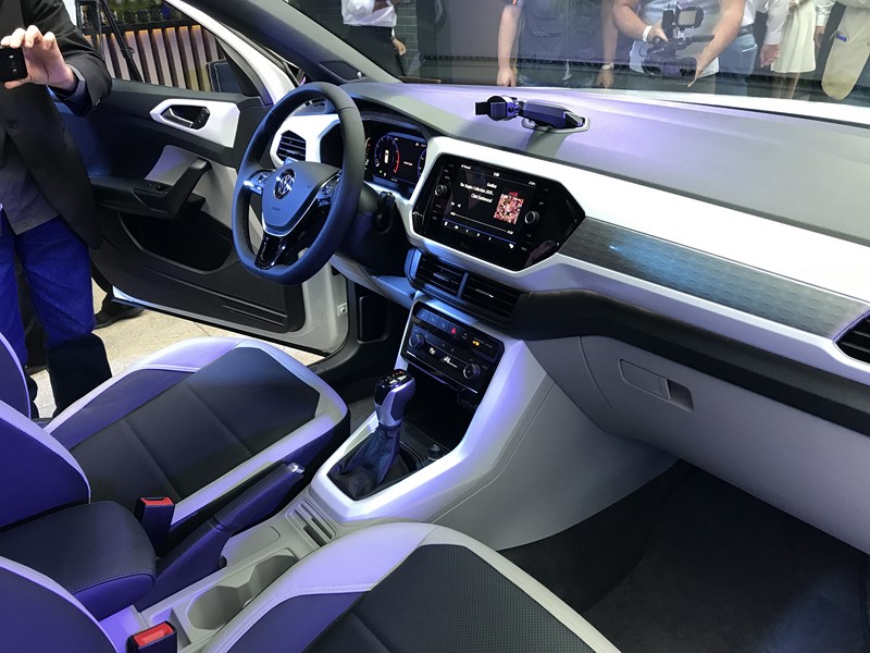 Por dentro, o painel do SUV também remete ao do Polo, mas tem personalidade própria. O desenho é mais elaborado e não é uma cópia fiel ao do hatch. Nos carros exibidos haviam alguns detalhes na mesma cor que a do exterior.