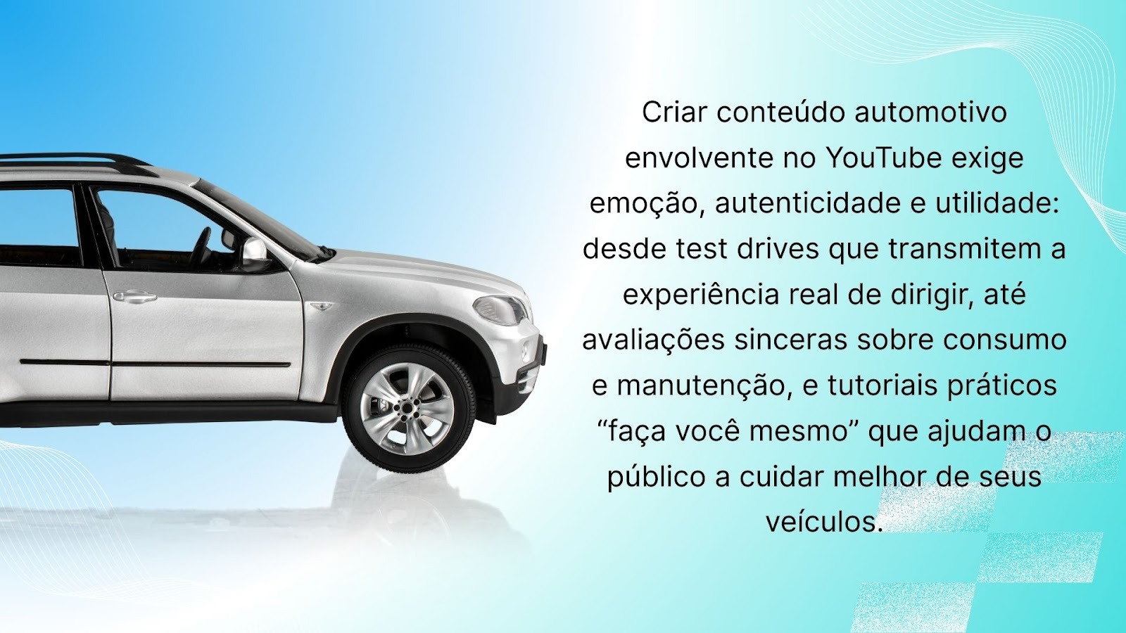 - Faça você mesmo: Tem coisa melhor do que abrir um vídeo no YouTube e encontrar dicas funcionais e fáceis para trocar óleo, instalar acessórios e fazer pequenos reparos? Para boa parte do público esse é o tipo de conteúdo mais interessante no nicho automotivo do YouTube.